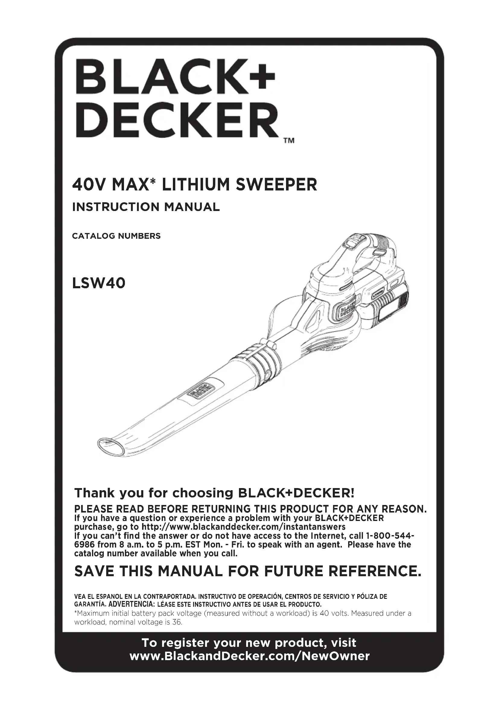 GRACIAS POR ELEGIR BLACK+DECKER! LEA EL MANUAL ANTES DE DEVOLVER ESTE PRODUCTO POR CUALQUIER MOTIVO: Si tiene una consulta o algún inconveniente con su producto Black+Decker, visite http://www.blackanddecker.com/instantanswers para obtener respuestas instantáneas las 24 horas del día. Si no encuentra la respuesta o no tiene acceso a Internet, lame al 1-800-544-6986 de lunes a viernes de 8 a. m. a 5 p. m. hora del Este para hablar con un agente. Cuando lame, tenga a mano el número de catálogo. CONSERVE ESTE MANUAL PARA FUTURAS CONSULTAS. SÓLO PARA USO DOMÉSTICO. *El máximo voltaje inicial del paquete de baterías (medido sin una carga de trabajo) es 40 voltios. Si se mide con una carga de trabajo, el voltaje nominal es 36.CATÁLOGO N° LSW40 LIGNES DIRECTRICES EN MATIÈRE DE SÉCURITÉ - DÉFINITIONS Il est important que vous lisiez et compreniez ce mode d’emploi. Les informations qu’il contient concernent VOTRE SÉCURITÉ et visent à ÉVITER TOUT PROBLÈME. Les symboles ci-dessous servent à vous aider à reconnaître cette information.