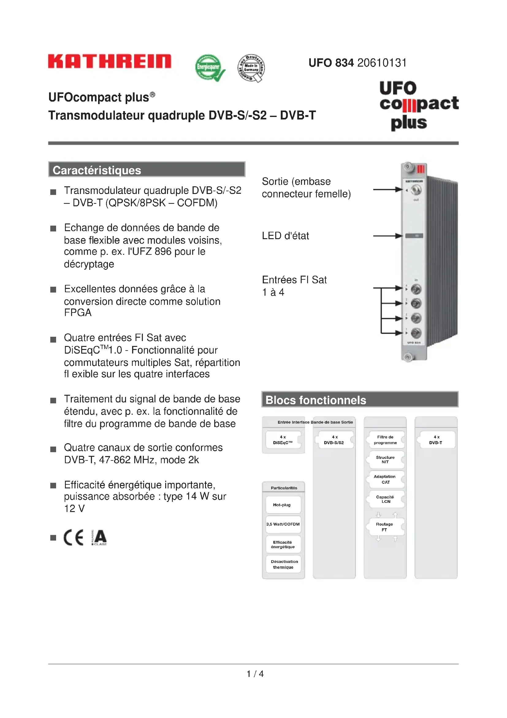 - Consignes d'utilisation de l'UFO 834 Remarque : Vous trouverez la version la plus récente des consignes d’utilisation de l'UFO 834 sur le site Kathrein : www.kathrein.de Processeur MPEG-FT Filtre du programme Filtre PID Traitement PSI/SI Table NIT câble, correction PCR, CAT Stuffi ng Automatique Modulateur COFDM Canaux de sortie 4 x DVB-T, mode 2k Constellation COFDM QPSK, 16 QAM, 64 QAM Guard-Intervall 1/4, 1/8, 1/16, 1/32 Débit de codes 1/2, 2/3, 3/4, 5/6, 7/8 Sortie HF Sortie DVB-T 1 x connecteur F, 75 Ω Plage de fréquences MHz 47 ... 1 006 (réglage fi n par pas de 125 kHz) Plage de fréquences (liste de canaux) MHz 47 ... 86/110 ... 862 (réglage par la liste de canaux) Atténuation de réfl exion dB 14 (47 MHz) -1,5 dB/Oct. Niveau de sortie dBμV97 Plage de réglage du niveau de sortie dB -20 (par niveaux de 0,5 dB) Stabilité du niveau dB ± 0,8 Stabilité de la fréquence ppm 35 MER dB ≥ 45 Amortissement d'épaulement dB ≥ 60 (pour niveau normalisé) Emissions parasites dB ≥ 60 Données système Puissance absorbée W type 14 (sur 12 V) Plage de températures °C -20 ... 50 Circuit de protection °C > 70 Dimensions (h x l x p) mm 265 x 36 x 220 Poids kg 1,16936.4606/-/VKDF/0813/FR - Sous réserve de modifi cations ! Internet : www.kathrein.de KATHREIN-Werke KG • Anton-Kathrein-Straße 1 - 3 • Boîte postale 100 444 • 83004 Rosenheim • ALLEMAGNE • Téléphone +49 8031 184-0 • Fax +49 8031 184-306 Mise en place Insérer l'UFO 834 sur un emplacement libre quelconque. Si des données de bande de base doivent être échangées avec un autre module (p. ex. l'UFZ 896), placer l'UFO 834 à droite ou à gauche de celui-ci. Veiller à ce que l'UFO 834 soit inséré entièrement et que le contact soit donc établi avec le fond de panier (la face avant de l'UFO 834 repose sur l'avant de l'unité de base). Fixer les deux vis moletées en haut et en bas (vis Torx). L'UFO 834 est reconnu automatiquement par l'UFX 800. La LED verte reste allumée en continu dès que l'UFO 834 est parvenu à son état de fonctionnement normal. Toutes les autres consignes d'utilisation fi gurent dans les instructions de service du logiciel de pilotage USW 800. Utilisation L'UFO 834 est piloté par le biais de l'interface utilisateur du logiciel de pilotage USW 800, dont l'assistance en ligne décrit également la confi guration de tous les modules UFOcompact plus