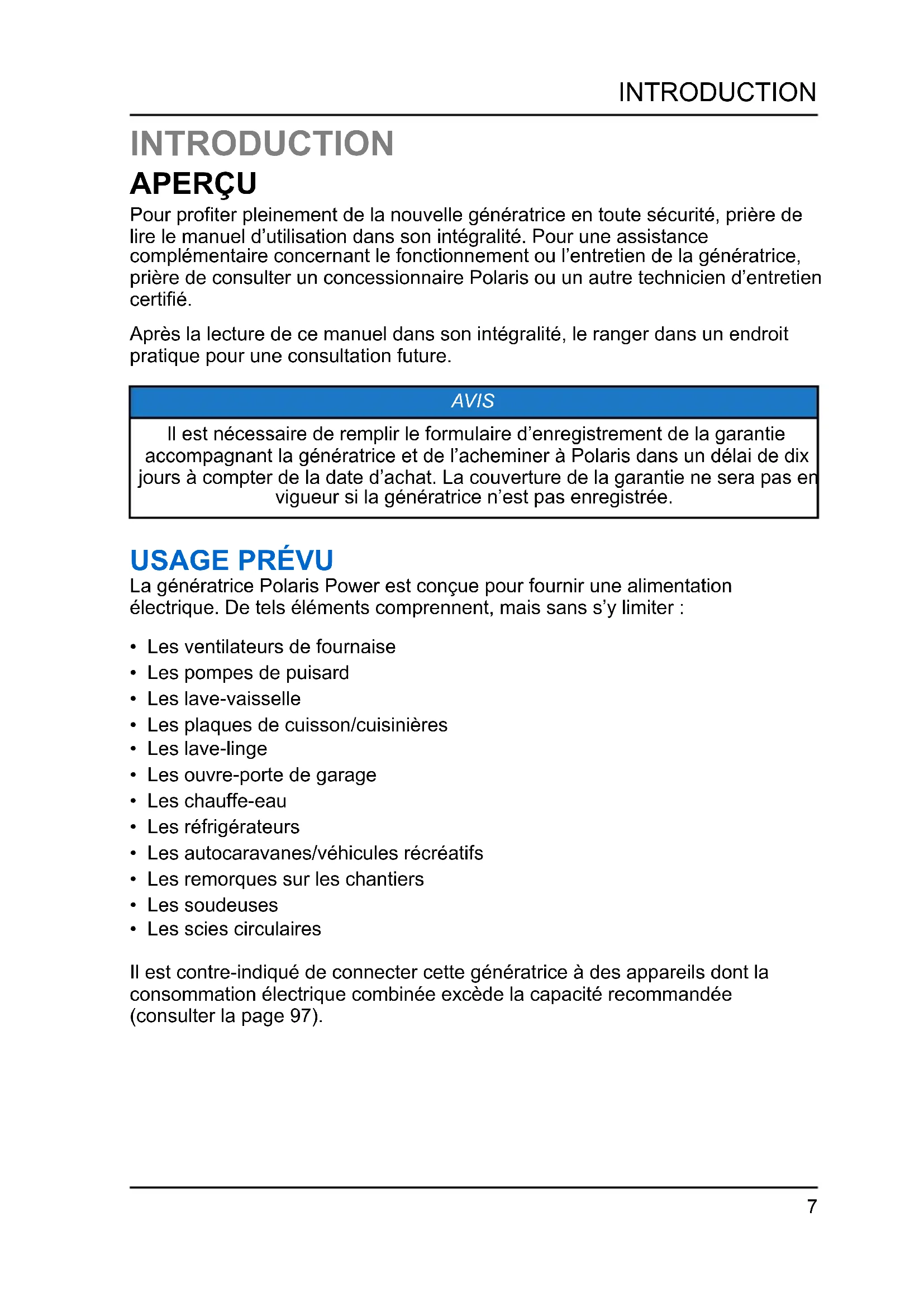- Registre d’entretien 56INTRODUCTION APERÇU Pour profiter pleinement de la nouvelle génératrice en toute sécurité, prière de lire le manuel d’utilisation dans son intégralité. Pour une assistance complémentaire concernant le fonctionnement ou l’entretien de la génératrice, prière de consulter un concessionnaire Polaris ou un autre technicien d’entretien certifié. Après la lecture de ce manuel dans son intégralité, le ranger dans un endroit pratique pour une consultation future. AVIS Il est nécessaire de remplir le formulaire d’enregistrement de la garantie accompagnant la génératrice et de l’acheminer à Polaris dans un délai de dix jours à compter de la date d’achat. La couverture de la garantie ne sera pas en vigueur si la génératrice n’est pas enregistrée. p. 119