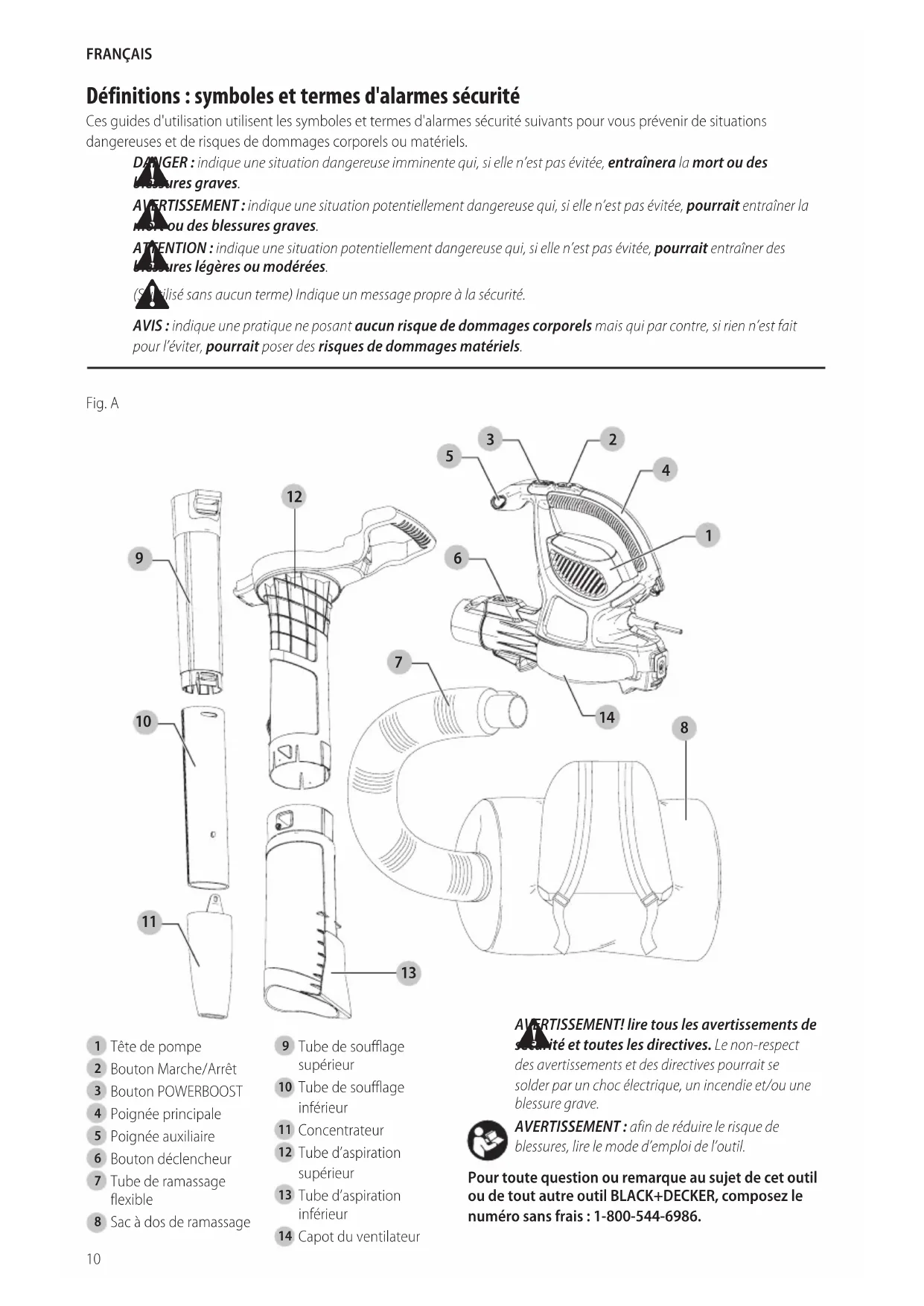 blessures, lire le mode d’emploi del’outil. Pour toute question ou remarque au sujet de cet outil ou de tout autre outil BLACK+DECKER, composez le numéro sans frais : 1-800-544-6986. Français (traduction de la notice d’instructions originale) Fig. A
