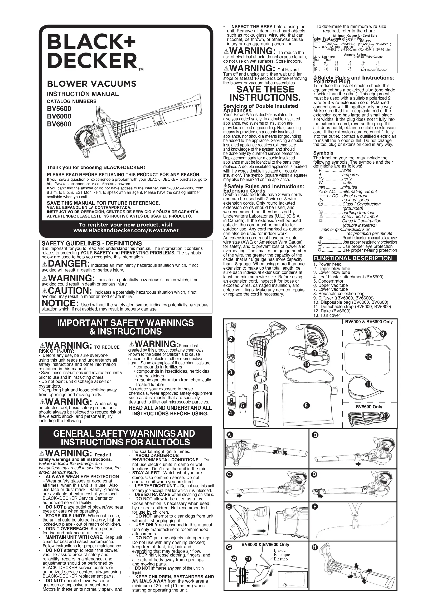 RISQUE DE COUPURE. Arrêter et débrancher l’appareil. Attendre au moins 10 secondes ou jusqu’à ce que le ventilateur s’arrête complètement avant de retirer l’assemblage de la souffleuse ou du tube d’aspiration. CONSERVER CES MESURES. Entretien des outils a double isolation La souffleuse-aspirateur à double isolation procure une protection supplémentaire. Dans ce type d’outil, les deux systèmes d’isolant remplacent la mise à la terre. Il n’y a aucun moyen de mettre l’outil à la terre et aucun système de mise à la terre ne doit être ajouté à l’outil. L’entretien d’un outil à double isolation exige beaucoup de soin et une excellente connaissance du système; il ne devrait être confié qu’à un technicien compétent. Les pièces de rechange de ce type d’outil doivent être identiques aux pièces d’origine. Un outil à double isolation porte l’inscription «DOUBLE INSULATED» ou «DOUBLE INSULATION». Le symbole (un carré à l’intérieur d’un carré) peut aussi figurer sur l’outil. M Mesures de sécurité : cordons de rallonge Les outils à double isolation sont munis d’un cordon bifilaire et ils peuvent être utilisés avec un cordon de rallonge muni de 2 ou de 3 fils. Il faut seulement utiliser des cordons de rallonge à gaine ronde et ils devraient être homologués par l’organisme américain Underwriters Laboratories (U.L.) ou la CSA (au Canada). Lorsque le cordon de rallonge est utilisé à l’extérieur, il doit être prévu à cet effet. Tout cordon extérieur peut servir à l’intérieur.Les cordons de rallonge doivent être faits de conducteurs de calibre approprié (AWG ou calibre moyen de fil) par mesure de sécurité et afin de prévenir les pertes de puissance et les surchauffes. Le numéro de calibre du fil est inversement proportionnel à la capacité du cordon. Ainsi, un cordon de calibre 16 a une capacité supérieure à un cordon de calibre 18. Lorsqu’il est nécessaire d’utiliser plus d’un cordon de rallonge, veiller à ce que chaque cordon ait au moins le calibre minimal. Avant d’utiliser un cordon de rallonge, s’assurer qu’il n’y a pas de fils dénudés ni détachés, et que l’isolant et les raccords ne sont pas défectueux. Effectuer les réparations nécessaires ou remplacer le cordon, le cas échéant.Le tableau ci-dessous permet de déterminer le calibre minimal des cordons. Mesures de sécurité : fiche polarisée Afin de minimiser les risques de secousses électriques, le produit comporte une fiche polarisée (une lame plus large que l’autre). Il faut utiliser une rallonge polarisée appropriée, bifilaire ou trifilaire, avec ce produit. Ce genre de fiche n’entre que d’une façon dans une prise polarisée. S’assurer que la prise de la rallonge comporte des fentes de dimensions appropriées. Lorsqu’on ne peut insérer la fiche à fond dans la prise de la rallonge, il faut tenter de le faire après avoir inversé les lames de côté. Si la fiche n’entre toujours pas dans la prise, il faut se procurer une rallonge appropriée. Lorsqu’on ne peut insérer la fiche de la rallonge à fond dans la prise, il faut communiquer avec un électricien certifié. Il ne faut pas neutraliser la fiche de l’outil ni celle de la rallonge.SYMBOLESL’étiquette apposée sur votre outil pourrait comprendre les symboles suivants. Les symboles et leurs définitions sont indiqués ci-après :V ................voltsA. ................ ampèresHz ............... hertzW ................ wattsmin .............. minutesou AC ..... courant alternatifou DC .. courant continuenon.............. régime à vide ................ Construction classe II .............. borne de terre ................symbole d’alerte à la sécurité.../min or rpm .......révolutions ou alternance par minute...............Lire le mode d’emploi avant l’utilisation .................Utiliser une protection respiratoire adéquate. .................Utiliser une protection oculaire adéquate. .................Utiliser une protection auditive adéquate. DESCRIPTION FONCTIONNELLE 1. Tête du moteur2. Tube supérieur du souffleur3. Tube inférieur du souffleur4. Accessoire pulvérisateur de feuilles (BV5600)5. Concentrateur6. Tube supérieur de l’aspirateur7. Tube inférieur de l’aspirateur8. Sac collecteur réutilisable9. Diffuseur (BV6000, BV6600)10. Sac jetable (BV6000, BV6600)11. Dragonne amovible (BV6000, BV6600)12. Râteau (BV6600)13. Capot du ventilateur DIRECTIVES ET AVERTISSEMENTS