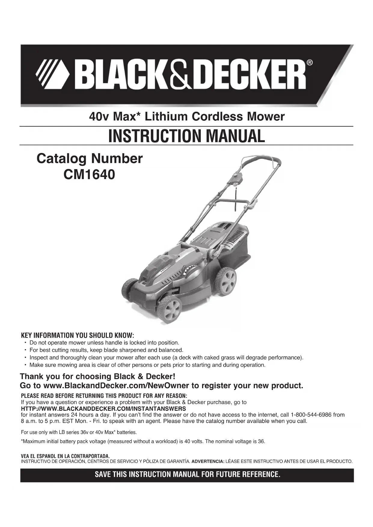 - S’assurer que la surface à tondre est à l’écart de toute personne ou animal de compagnie avant de démarrer la tondeuse et en cours d’utilisation. *La tension initiale maximale du bloc-piles (mesurée sans charge de travail) est de 40 volts. La tension nominale est de 36. A utiliser uniquement avec 36v de série LB ou 40v batteries Max* Tondeuse sans fil avec bloc-piles au lithium-ion de 40 V max.* guide d’utilisation Merci d’avoir choisi Black & Decker! Consulter le site Web www.BlackandDecker.com/ NewOwner pour enregistrer votre nouveau produit. À lire aVant de retourner ce produit pour quelque raison que ce soit : Si des questions ou des problèmes surgissent après l’achat d’un produit Black & Decker, consulter le site Web HTTP://WWW.BLACKANDDECKER. COM/INSTANTANSWERS Si la réponse est introuvable ou en l’absence d’accès à l’Internet, composer le 1 800 544-6986 de 8 h à 17 h HNE, du lundi au vendredi, pour parler avec un agent. Prière d’avoir le numéro de catalogue sous la main lors de l’appel.pour obtenir des réponses instantanément 24 heures par jour.CONSERVER CE MANUEL POUR UN USAGE ULTÉRIEUR. Modèle CM164010 Voici une explication des symboles de danger importants sur la tondeuse.