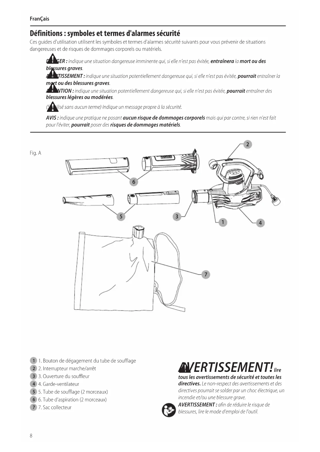 MISE EN GARDE : S’assurer que le souffleur est éteint et débranché de l’alimentation. Le tube d’aspiration et le sac collecteur doivent être assemblés sur le boîtier avant d’utiliser l’appareil.