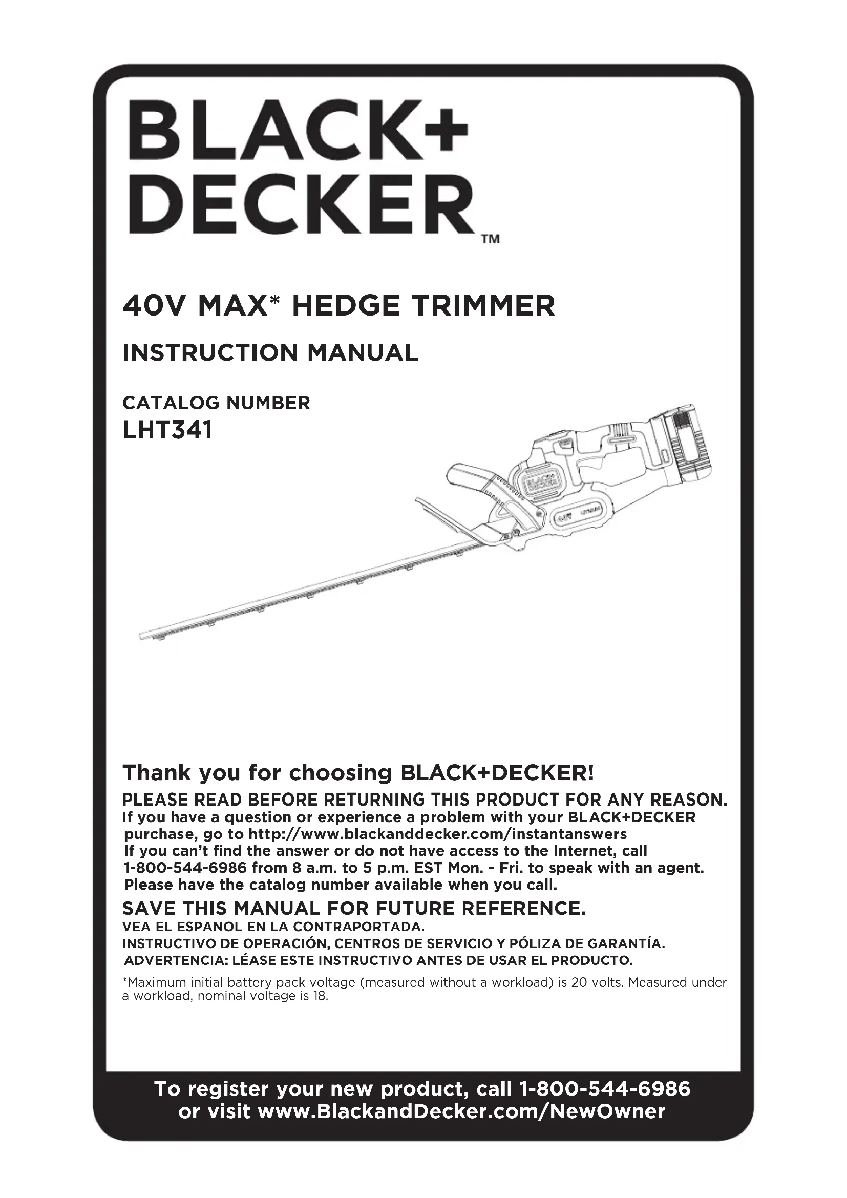 Merci d’avoir choisi BLACK+DECKER! Consulter le site Web www.BlackandDecker.com/NewOwner pour enregistrer votre nouveau produit.ÀLIRE AVANT DE RETOURNER CE PRODUIT POUR QUELQUE RAISON QUE CE SOIT :Si des questions ou des problèmes surgissent après l’achat d’un produit BLACK+DECKER, consulter le site Web www.blackanddecker.com/instantanswers pour obtenir des réponses instantanément 24 heures par jour. Si la réponse est introuvable ou en l’absence d’accès à l’Internet, composer le 1 800 544-6986 de 8 h à 17 h HNE, du lundi au vendredi, pour parler avec un agent. Prière d’avoir le numéro de catalogue sous la main lors de l’appel.CONSERVER CE MODE D’EMPLOI POUR UN USAGE ULTÉRIEUR.*La tension initiale maximale du bloc-piles (mesurée sans charge de travail) est de 20 volts. La tension nominale est de 18.NUMERO DE CATALOGUE LHT341 lIGneS dIrecTrIceS en MaTIère de SécurITé - défInITIonS Il est important que vous lisiez et compreniez ce mode d’emploi. Les informations qu’il contient concernent VOTRE SÉCURITÉ et visent à ÉVITER TOUT PROBLÈME. Les symboles ci-dessous servent à vous aider à reconnaître cette information.