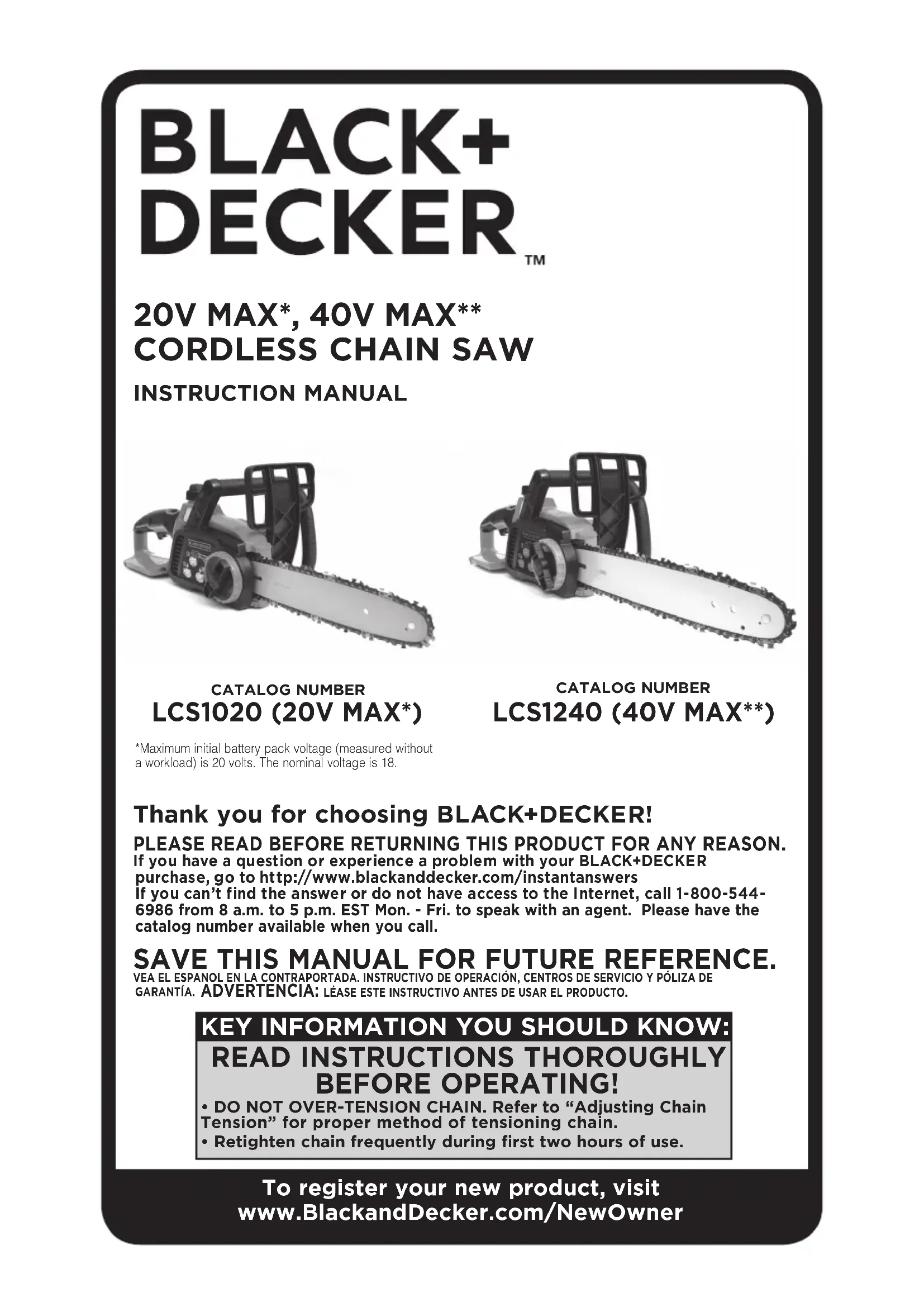 - NE PAS SUR TENDRE LA CHAÎNE. Se reporter à la section « RÉGLAGE DE LA TENSION DE LA CHAÎNE » pour savoir comment tendre correctement la chaîne. • Retendre la chaîne fréquemment pendant les deux premières heures d’utilisation.NUMERO DE CATALOGUE LCS1020 (20V MAX*)