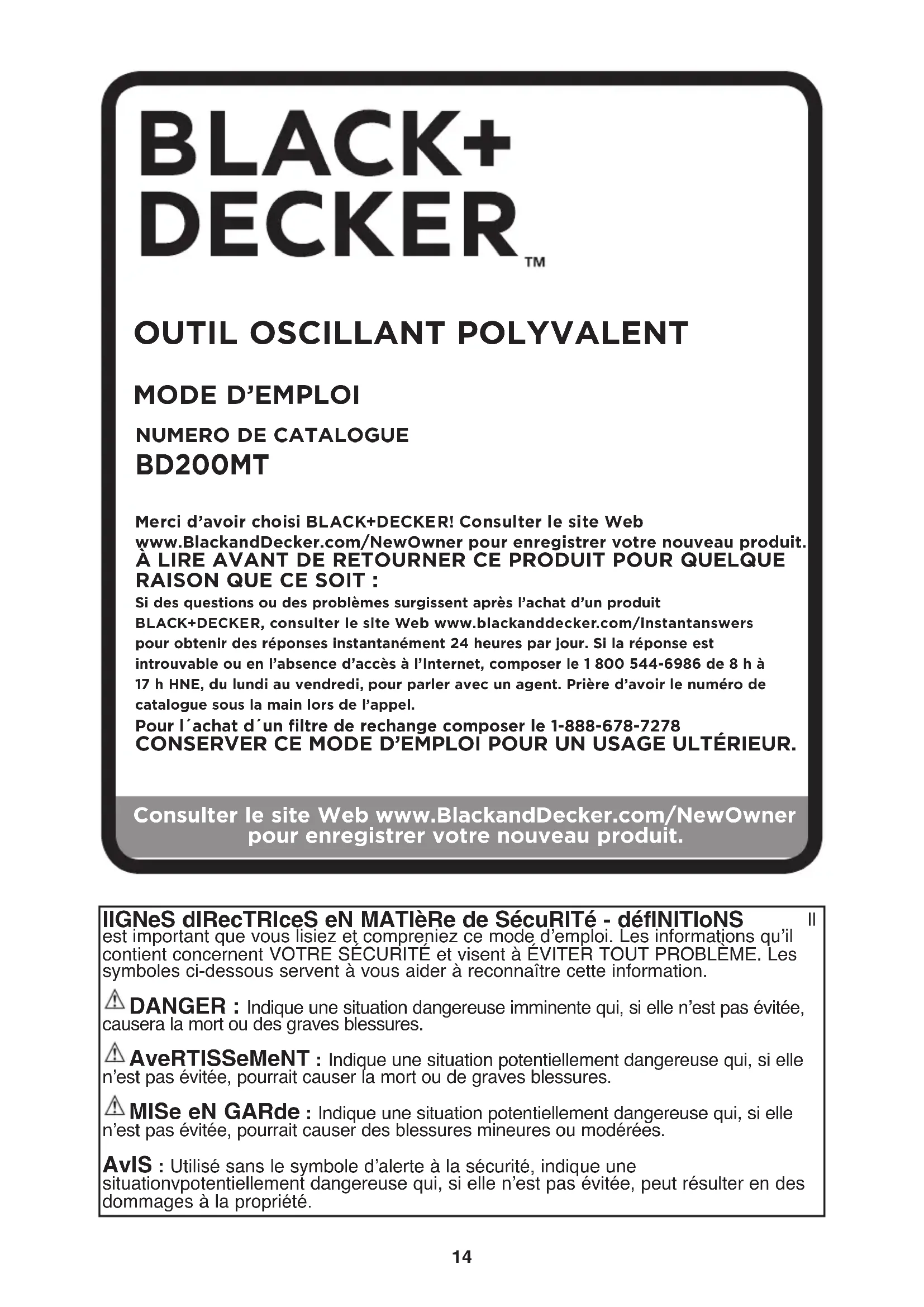 Merci d’avoir choisi BLACK+DECKER! Consulter le site Web www.BlackandDecker.com/NewOwner pour enregistrer votre nouveau produit.ÀLIRE AVANT DE RETOURNER CE PRODUIT POUR QUELQUE RAISON QUE CE SOIT :Si des questions ou des problèmes surgissent après l’achat d’un produit BLACK+DECKER, consulter le site Web www.blackanddecker.com/instantanswers pour obtenir des réponses instantanément 24 heures par jour. Si la réponse est introuvable ou en l’absence d’accès à l’Internet, composer le 1 800 544-6986 de 8 h à 17 h HNE, du lundi au vendredi, pour parler avec un agent. Prière d’avoir le numéro de catalogue sous la main lors de l’appel.Pour l´achat d´un filtre de rechange composer le 1-888-678-7278CONSERVER CE MODE D’EMPLOI POUR UN USAGE ULTÉRIEUR.NUMERO DE CATALOGUE BD200MT15 Avertissements de sécurité généraux pour les outils électriques AVERTISSEMENT! Lire tous les avertissements de sécurité et toutes les directives. Le non-respect des avertissements et des directives pourrait se solder par un choc électrique, un incendie et/ou une blessure grave. Conserver tous les avertissements et toutes les directives pour un usage ultérieur. Le terme «outil électrique» cité dans les avertissements se rapporte à votre outil électrique à alimentation sur secteur (avec fil) ou par piles (sans fil).