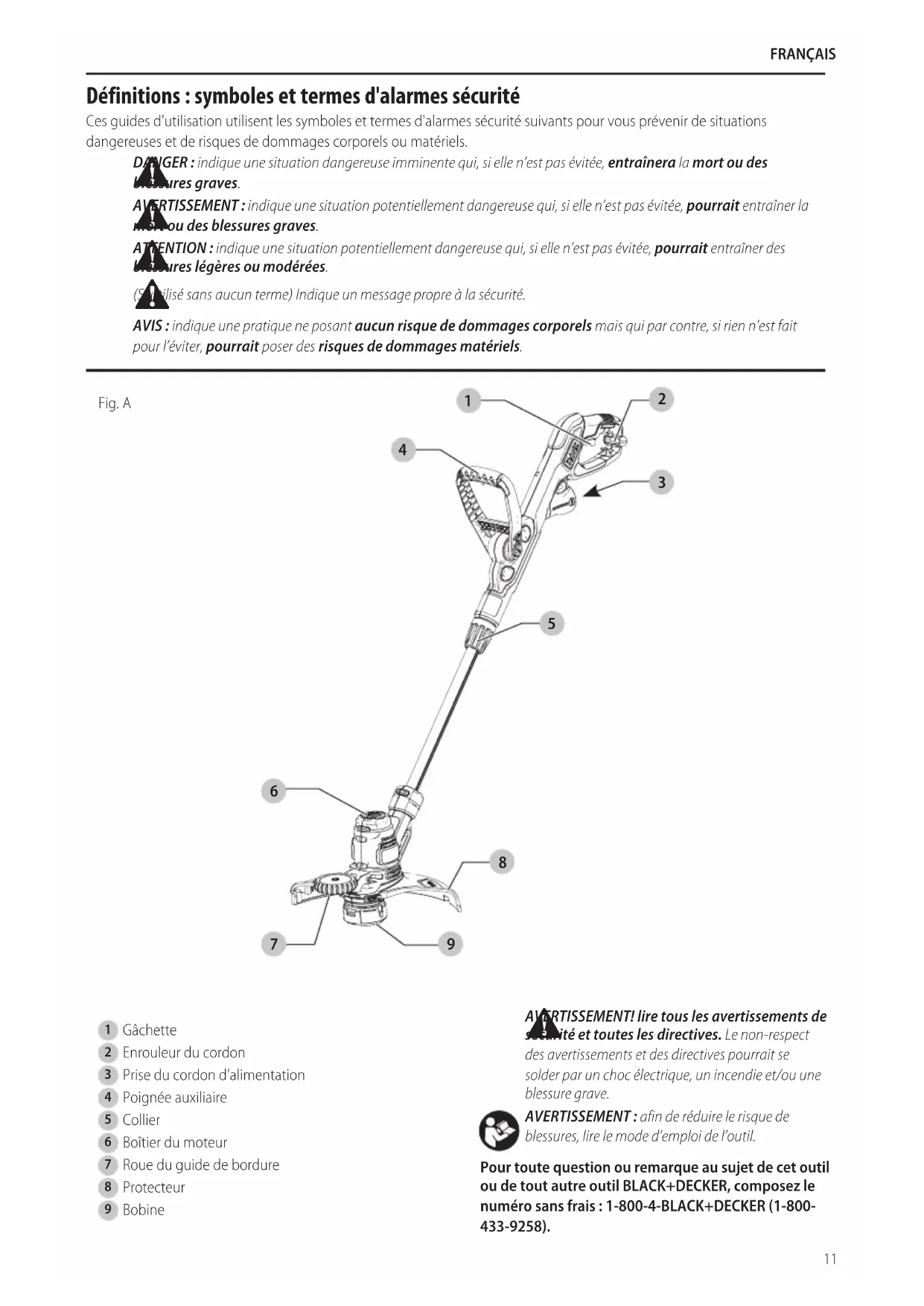blessures, lire le mode d’emploi del’outil. Pour toute question ou remarque au sujet de cet outil ou de tout autre outil BLACK+DECKER, composez le numéro sans frais : 1-800-4-BLACK+DECKER (1-800- 433-9258).