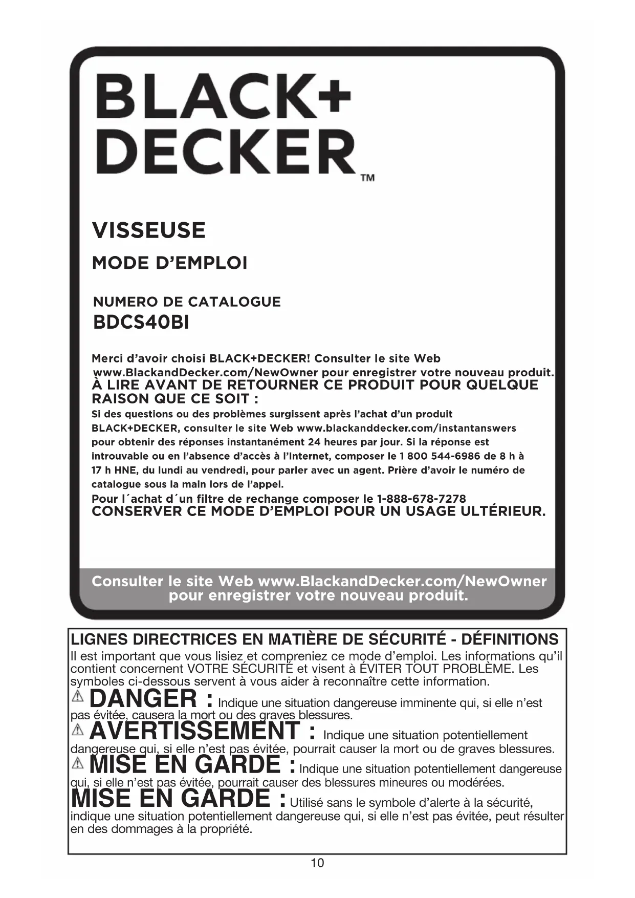 VISSEUSE Merci d’avoir choisi BLACK+DECKER! Consulter le site Web www.BlackandDecker.com/NewOwner pour enregistrer votre nouveau produit.ÀLIRE AVANT DE RETOURNER CE PRODUIT POUR QUELQUE RAISON QUE CE SOIT :Si des questions ou des problèmes surgissent après l’achat d’un produit BLACK+DECKER, consulter le site Web www.blackanddecker.com/instantanswers pour obtenir des réponses instantanément 24 heures par jour. Si la réponse est introuvable ou en l’absence d’accès à l’Internet, composer le 1 800 544-6986 de 8 h à 17 h HNE, du lundi au vendredi, pour parler avec un agent. Prière d’avoir le numéro de catalogue sous la main lors de l’appel.Pour l´achat d´un filtre de rechange composer le 1-888-678-7278CONSERVER CE MODE D’EMPLOI POUR UN USAGE ULTÉRIEUR.NUMERO DE CATALOGUE BDCS40BI lIGneS dIrecTrIceS en MaTIère de SécurITé - défInITIonS Il est important que vous lisiez et compreniez ce mode d’emploi. Les informations qu’il contient concernent VOTRE SÉCURITÉ et visent à ÉVITER TOUT PROBLÈME. Les symboles ci-dessous servent à vous aider à reconnaître cette information.