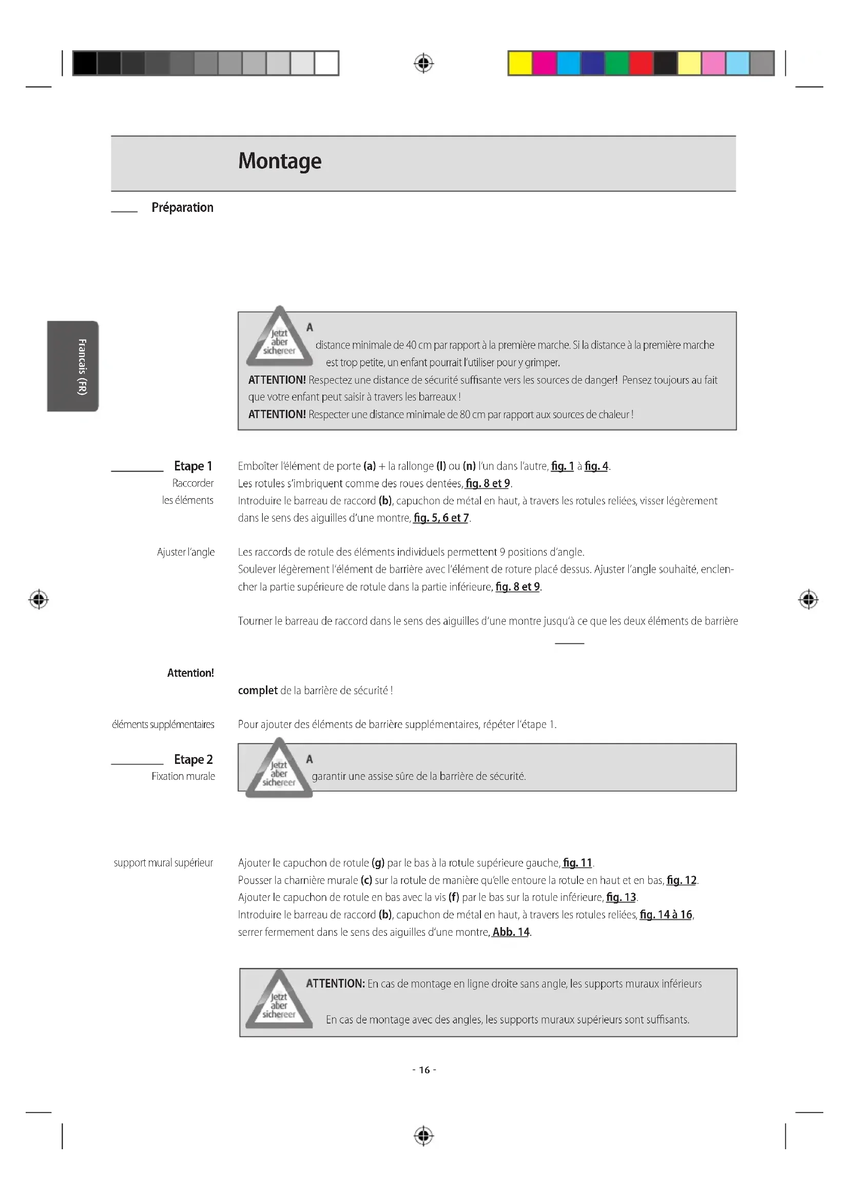 ATTENTION! distance minimale de 40 cm par rapport à la première marche. Si la distance à la première marche est trop petite, un enfant pourrait l‘utiliser pour y grimper. ATTENTION! Respectez une distance de sécurité suffisante vers les sources de danger! Pensez toujours au fait que votre enfant peut saisir à travers les barreaux ! ATTENTION! Respecter une distance minimale de 80 cm par rapport aux sources de chaleur ! Emboîter l‘élément de porte (a) + la rallonge (l) ou (n) l‘un dans l‘autre, fig. 1 à fig. 4. Les rotules s‘imbriquent comme des roues dentées, fig. 8 et 9. Introduire le barreau de raccord (b), capuchon de métal en haut, à travers les rotules reliées, visser légèrement dans le sens des aiguilles d‘une montre, fig. 5, 6 et 7. Les raccords de rotule des éléments individuels permettent 9 positions d‘angle. Soulever légèrement l‘élément de barrière avec l‘élément de roture placé dessus. Ajuster l‘angle souhaité, enclen- cher la partie supérieure de rotule dans la partie inférieure, fig. 8 et 9. Tourner le barreau de raccord dans le sens des aiguilles d‘une montre jusqu‘à ce que les deux éléments de barrière fig. 10. après l‘encastrement complet de la barrière de sécurité ! Pour ajouter des éléments de barrière supplémentaires, répéter l‘étape 1. ATTENTION: garantir une assise sûre de la barrière de sécurité.