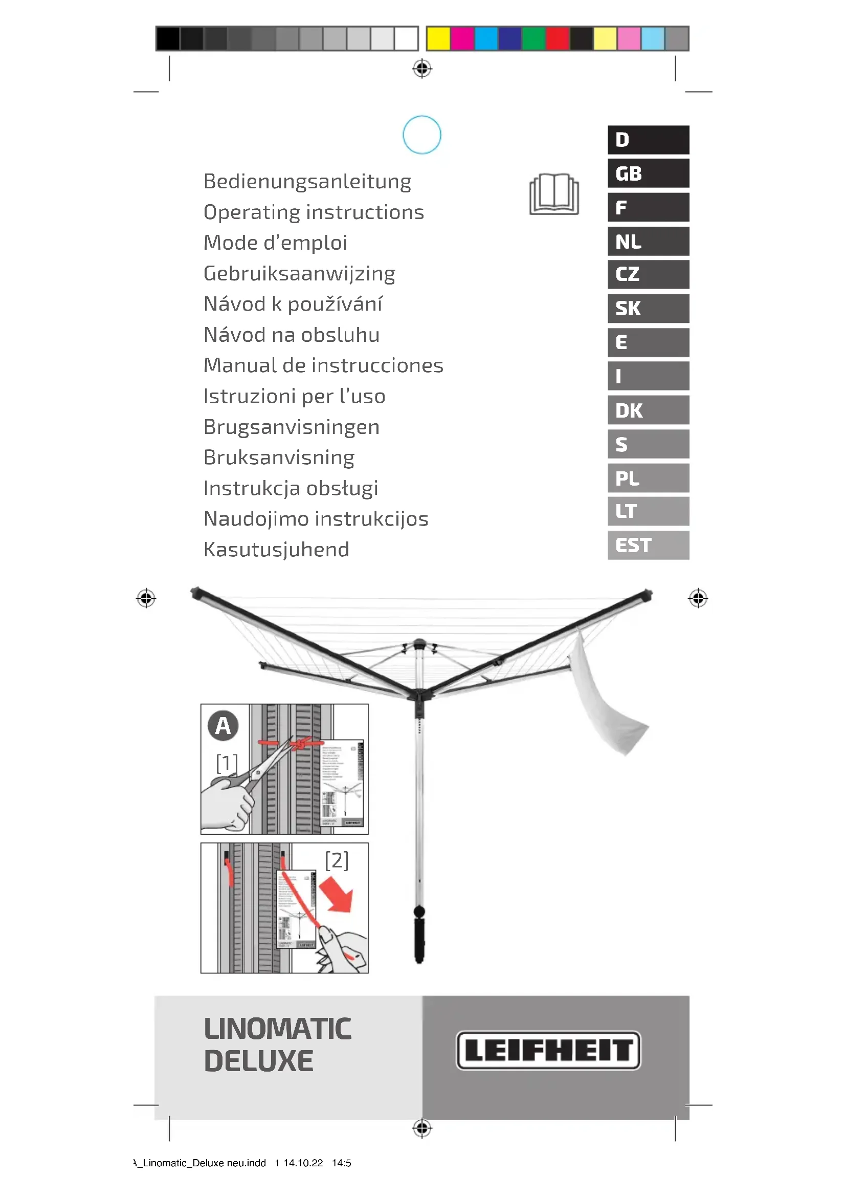 tion fournies ; En cas de garantie, Leifheit vous accorde à sa discrétion absolue la réparation des pièces défectueuses ou l’échange du produit. Si une réparation ne peut pas être eectuée et un produit identique est en rupture de stock à des ns d’échange, vous obtiendrez éventuellement un produit de remplacement d’une valeur comparable. En cas de garantie, le remboursement du prix d‘achat est impossible. La garantie ne couvre pas non plus les demandes de dommages-intérêts. Pour le recours à la garantie, veuillez faire parvenir le produit défectueux et le justicatif d‘achat (copie) au commerçant auprès duquel le produit a été acheté. Cette garantie est valable dans le monde entier. Vos droits statutaires, en particulier les droits de garantie, restent applicables et ne sont pas limités par cette garantie. *BA_Linomatic_Deluxe neu.indd 14 14.10.22 14:56Nederlands Beste Leifheit-Linomatic-klant, gefeliciteerd met uw keuze voor een Leifheit droogmolen van topkwaliteit. Om de hoogwaardige kwaliteit te waarborgen, wordt elke Linomatic bij de productie getest en voorzien van een controlenummer. Dit nummer staat op de paal, op een hoogte van circa 50 cm boven de grond. Het beste kunt u het controle- nummer meteen hier invoeren. Om lang plezier te hebben van de hoogwaardige kwaliteit van uw Linomatic, is het belangrijk de onderhoudsaanwijzingen goed in acht te nemen. De gebruiks- aanwijzing zorgvuldig doorlezen en goed bewaren, samen met het aankoopbewijs. Controlenummer