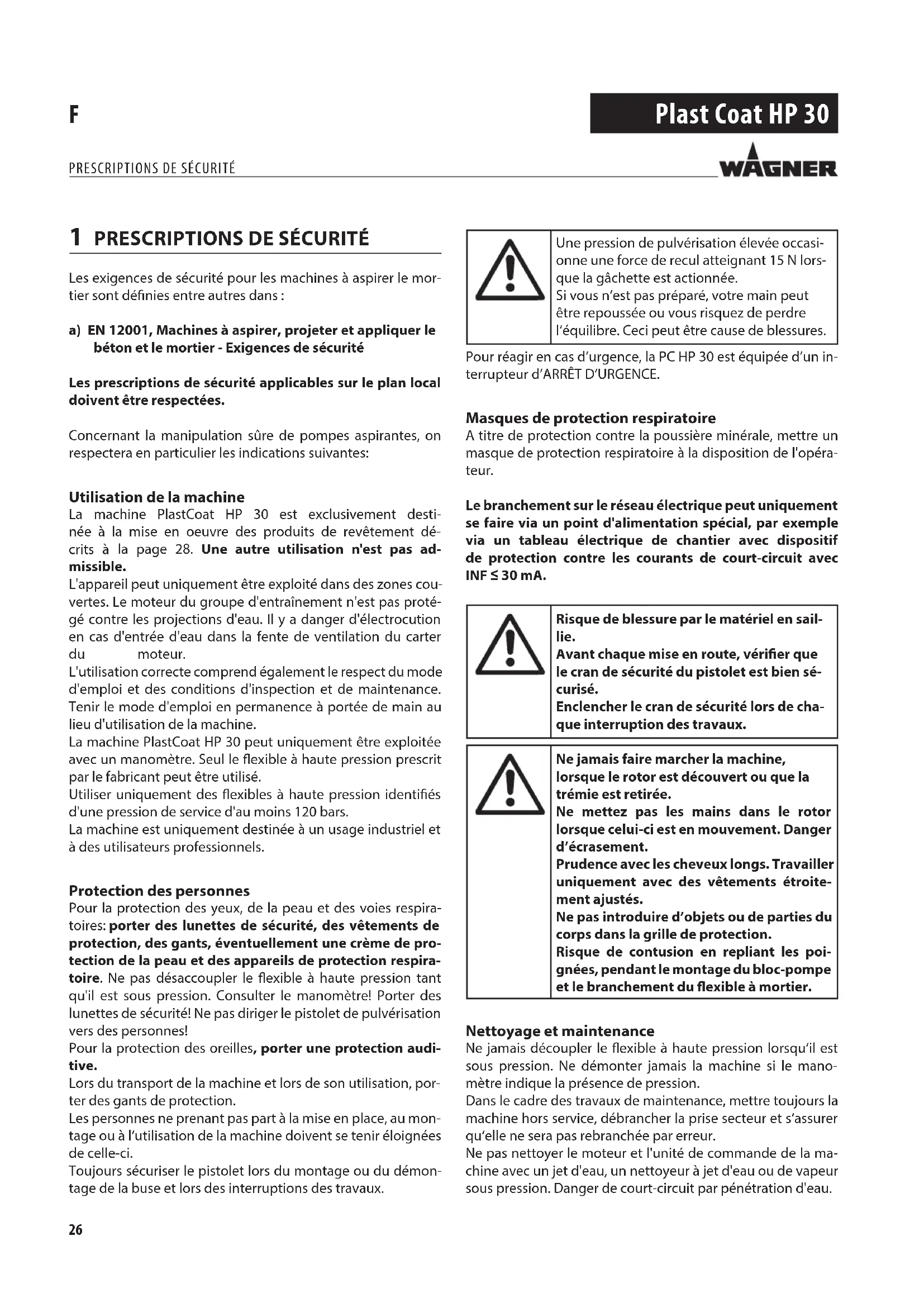 Les exigences de sécurité pour les machines à aspirer le mor- tier sont dénies entre autres dans : a) EN 12001, Machines à aspirer, projeter et appliquer le béton et le mortier - Exigences de sécurité Les prescriptions de sécurité applicables sur le plan local doivent être respectées. Concernant la manipulation sûre de pompes aspirantes, on respectera en particulier les indications suivantes: Utilisation de la machine La machine PlastCoat HP 30 est exclusivement desti- née à la mise en oeuvre des produits de revêtement dé- crits à la page 28. Une autre utilisation n'est pas ad- missible. L'appareil peut uniquement être exploité dans des zones cou- vertes. Le moteur du groupe d'entraînement n'est pas proté- gé contre les projections d'eau. Il y a danger d'électrocution en cas d'entrée d'eau dans la fente de ventilation du carter du moteur. L'utilisation correcte comprend également le respect du mode d'emploi et des conditions d'inspection et de maintenance. Tenir le mode d'emploi en permanence à portée de main au lieu d'utilisation de la machine. La machine PlastCoat HP 30 peut uniquement être exploitée avec un manomètre. Seul le exible à haute pression prescrit par le fabricant peut être utilisé. Utiliser uniquement des exibles à haute pression identiés d'une pression de service d'au moins 120 bars. La machine est uniquement destinée à un usage industriel et à des utilisateurs professionnels. Protection des personnes Pour la protection des yeux, de la peau et des voies respira- toires: porter des lunettes de sécurité, des vêtements de protection, des gants, éventuellement une crème de pro- tection de la peau et des appareils de protection respira- toire. Ne pas désaccoupler le exible à haute pression tant qu'il est sous pression. Consulter le manomètre! Porter des lunettes de sécurité! Ne pas diriger le pistolet de pulvérisation vers des personnes! Pour la protection des oreilles, porter une protection audi- tive. Lors du transport de la machine et lors de son utilisation, por- ter des gants de protection. Les personnes ne prenant pas part à la mise en place, au mon- tage ou à l‘utilisation de la machine doivent se tenir éloignées de celle-ci. Toujours sécuriser le pistolet lors du montage ou du démon- tage de la buse et lors des interruptions des travaux. Une pression de pulvérisation élevée occasi- onne une force de recul atteignant 15 N lors- que la gâchette est actionnée. Si vous n‘est pas préparé, votre main peut être repoussée ou vous risquez de perdre l‘équilibre. Ceci peut être cause de blessures. Pour réagir en cas d’urgence, la PC HP 30 est équipée d’un in- terrupteur d’ARRÊT D’URGENCE. Masques de protection respiratoire A titre de protection contre la poussière minérale, mettre un masque de protection respiratoire à la disposition de l'opéra- teur. Le branchement sur le réseau électrique peut uniquement se faire via un point d'alimentation spécial, par exemple via un tableau électrique de chantier avec dispositif de protection contre les courants de court-circuit avec INF 30 mA. Risque de blessure par le matériel en sail- lie. Avant chaque mise en route, vérier que le cran de sécurité du pistolet est bien sé- curisé. Enclencher le cran de sécurité lors de cha- que interruption des travaux. Ne jamais faire marcher la machine, lorsque le rotor est découvert ou que la trémie est retirée. Ne mettez pas les mains dans le rotor lorsque celui-ci est en mouvement. Danger d’écrasement. Prudence avec les cheveux longs. Travailler uniquement avec des vêtements étroite- ment ajustés. Ne pas introduire d’objets ou de parties du corps dans la grille de protection. Risque de contusion en repliant les poi- gnées, pendant le montage du bloc-pompe et le branchement du exible à mortier. Nettoyage et maintenance Ne jamais découpler le exible à haute pression lorsqu‘il est sous pression. Ne démonter jamais la machine si le mano- mètre indique la présence de pression. Dans le cadre des travaux de maintenance, mettre toujours la machine hors service, débrancher la prise secteur et s‘assurer qu‘elle ne sera pas rebranchée par erreur. Ne pas nettoyer le moteur et l'unité de commande de la ma- chine avec un jet d'eau, un nettoyeur à jet d'eau ou de vapeur sous pression. Danger de court-circuit par pénétration d'eau.27 Plast Coat HP 30