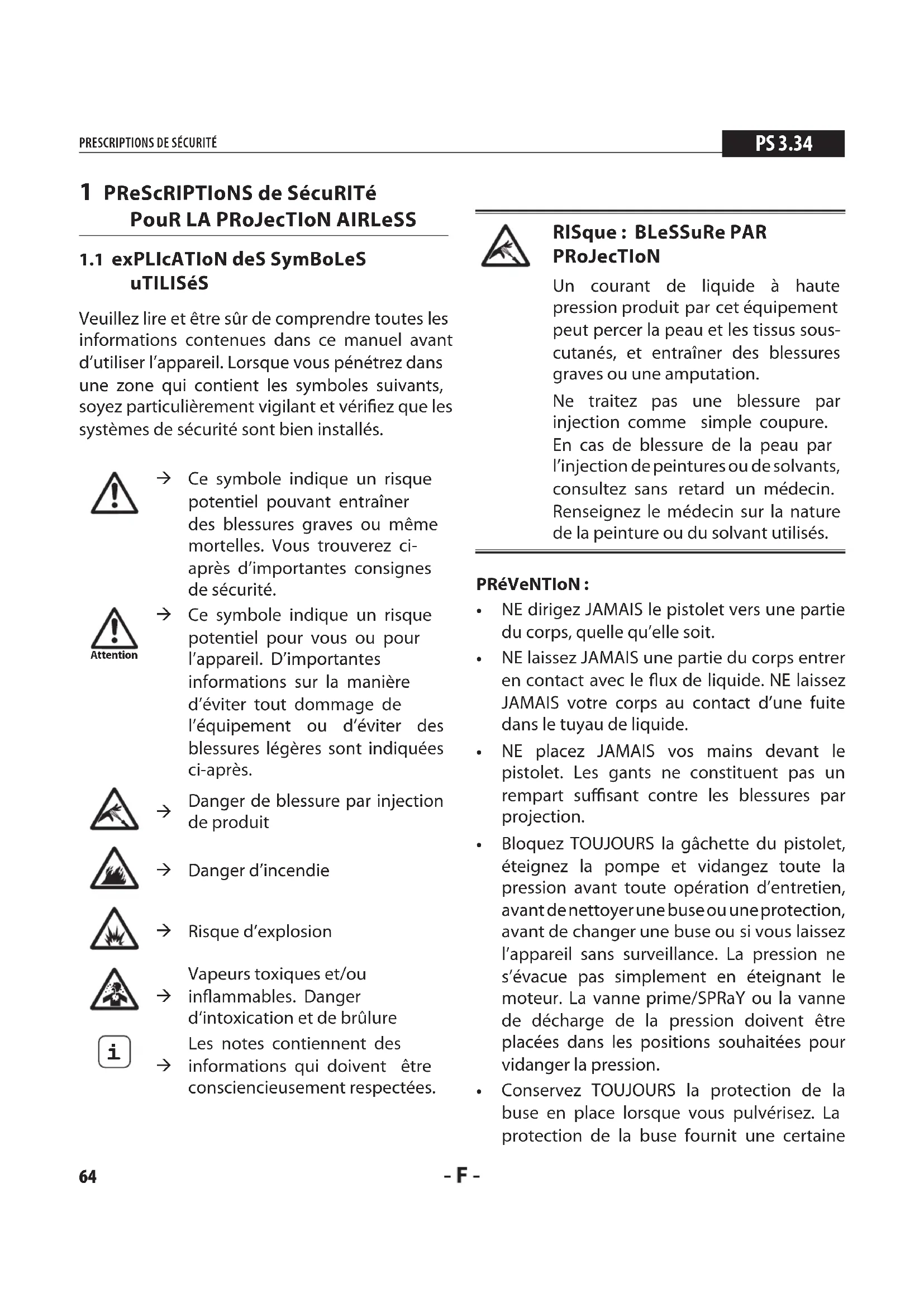 - Assurez vous que le tuyau à air et les tuyaux de pulvérisation sont disposés de façon à éviter les risques de glissade, de trébuchement ou de chute.66 prescriptiOns de sécurité PS 3.34 RISque : exPLoSIoN eT INceNdIe Les vapeurs inammables, telles que les vapeurs de solvant et de peinture, dans une zone de travail peuvent s’enammer ou exploser. PRéVeNTIoN :