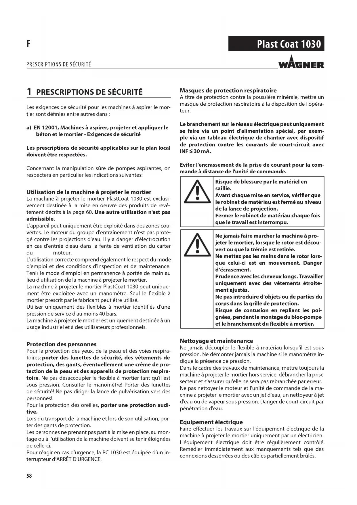 Les exigences de sécurité pour les machines à aspirer le mor- tier sont dénies entre autres dans : a) EN 12001, Machines à aspirer, projeter et appliquer le béton et le mortier - Exigences de sécurité Les prescriptions de sécurité applicables sur le plan local doivent être respectées. Concernant la manipulation sûre de pompes aspirantes, on respectera en particulier les indications suivantes: Utilisation de la machine à projeter le mortier La machine à projeter le mortier PlastCoat 1030 est exclusi- vement destinée à la mise en oeuvre des produits de revê- tement décrits à la page 60. Une autre utilisation n'est pas admissible. L'appareil peut uniquement être exploité dans des zones cou- vertes. Le moteur du groupe d'entraînement n'est pas proté- gé contre les projections d'eau. Il y a danger d'électrocution en cas d'entrée d'eau dans la fente de ventilation du carter du moteur. L'utilisation correcte comprend également le respect du mode d'emploi et des conditions d'inspection et de maintenance. Tenir le mode d'emploi en permanence à portée de main au lieu d'utilisation de la machine à projeter le mortier. La machine à projeter le mortier PlastCoat 1030 peut unique- ment être exploitée avec un manomètre. Seul le exible à mortier prescrit par le fabricant peut être utilisé. Utiliser uniquement des exibles à mortier identiés d'une pression de service d'au moins 40 bars. La machine à projeter le mortier est uniquement destinée à un usage industriel et à des utilisateurs professionnels. Protection des personnes Pour la protection des yeux, de la peau et des voies respira- toires: porter des lunettes de sécurité, des vêtements de protection, des gants, éventuellement une crème de pro- tection de la peau et des appareils de protection respira- toire. Ne pas désaccoupler le exible à mortier tant qu'il est sous pression. Consulter le manomètre! Porter des lunettes de sécurité! Ne pas diriger la lance de pulvérisation vers des personnes! Pour la protection des oreilles, porter une protection audi- tive. Lors du transport de la machine et lors de son utilisation, por- ter des gants de protection. Les personnes ne prenant pas part à la mise en place, au mon- tage ou à l‘utilisation de la machine doivent se tenir éloignées de celle-ci. Pour réagir en cas d’urgence, la PC 1030 est équipée d’un in- terrupteur d’ARRÊT D’URGENCE. Masques de protection respiratoire A titre de protection contre la poussière minérale, mettre un masque de protection respiratoire à la disposition de l'opéra- teur. Le branchement sur le réseau électrique peut uniquement se faire via un point d'alimentation spécial, par exem- ple via un tableau électrique de chantier avec dispositif de protection contre les courants de court-circuit avec INF ≤ 30 mA. Eviter l'encrassement de la prise de courant pour la com- mande à distance de l'unité de commande. Risque de blessure par le matériel en saillie. Avant chaque mise en service, vérier que le robinet de matériau est fermé au niveau de la lance de projection. Fermer le robinet de matériau chaque fois que le travail est interrompu. Ne jamais faire marcher la machine à pro- jeter le mortier, lorsque le rotor est décou- vert ou que la trémie est retirée. Ne mettez pas les mains dans le rotor lors- que celui-ci est en mouvement. Danger d’écrasement. Prudence avec les cheveux longs. Travailler uniquement avec des vêtements étroite- ment ajustés. Ne pas introduire d’objets ou de parties du corps dans la grille de protection. Risque de contusion en repliant les poi- gnées, pendant le montage du bloc-pompe et le branchement du exible à mortier. Nettoyage et maintenance Ne jamais découpler le exible à matériau lorsqu‘il est sous pression. Ne démonter jamais la machine si le manomètre in- dique la présence de pression. Dans le cadre des travaux de maintenance, mettre toujours la machine à projeter le mortier hors service, débrancher la prise secteur et s‘assurer qu‘elle ne sera pas rebranchée par erreur. Ne pas nettoyer le moteur et l'unité de commande de la ma- chine à projeter le mortier avec un jet d'eau, un nettoyeur à jet d'eau ou de vapeur sous pression. Danger de court-circuit par pénétration d'eau. Equipement électrique Faire eectuer les travaux sur l'équipement électrique de la machine à projeter le mortier uniquement par un électricien. L'équipement électrique doit être régulièrement contrôlé. Remédier immédiatement aux manquements tels que des connexions desserrées ou des câbles partiellement brûlés.59 Plast Coat 1030