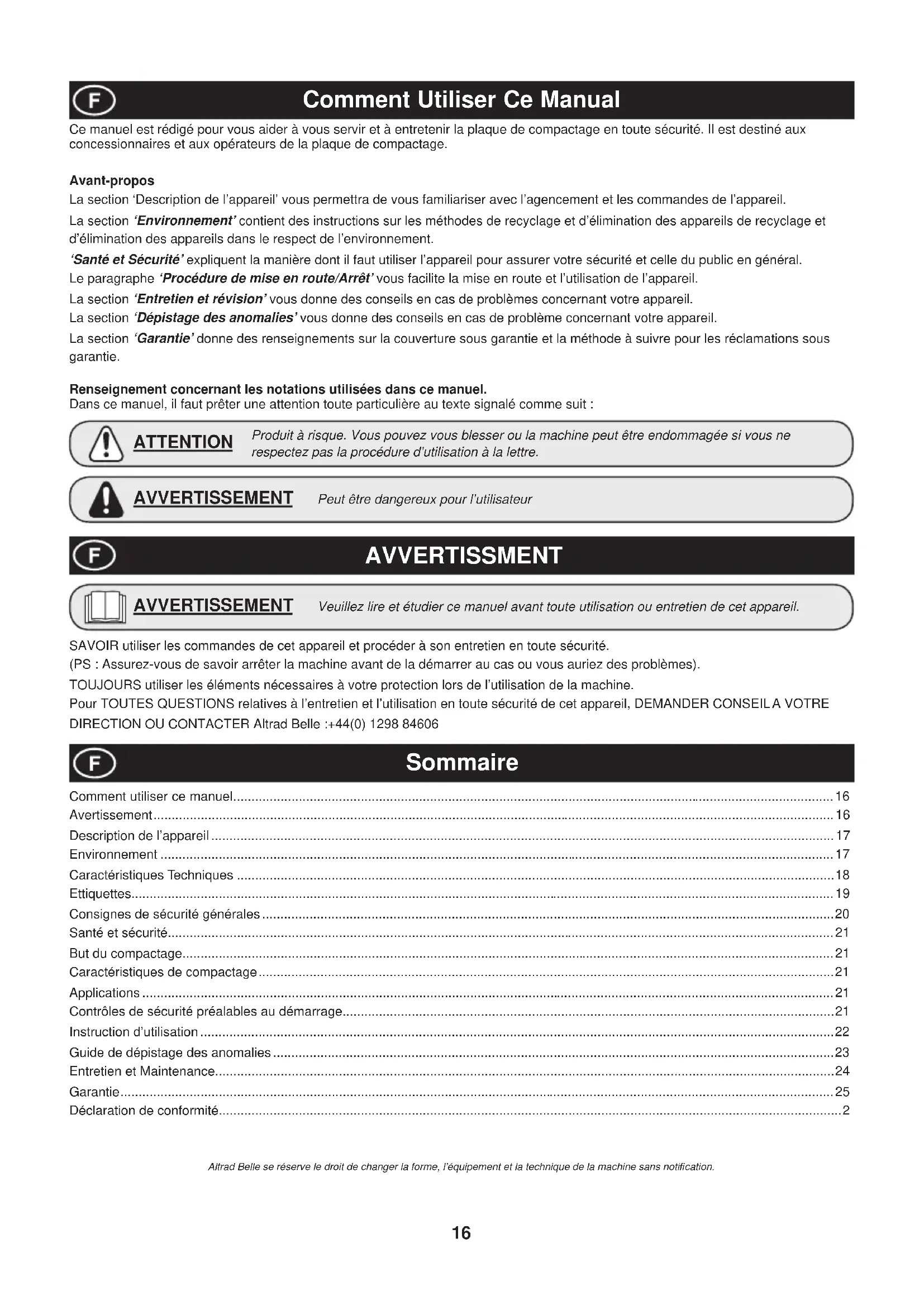 - Drivebelt/s Altrad Belle and/or their recognised agents, directors, employees or insurers will not be held liable for consequential or other damages, losses or expenses in connection with or by reason of or the inability to use the machine for any purpose. Warranty Claims All warranty claims should ¿ rstly be directed to Altrad Belle, either by telephone, by Fax, by Email, or in writing. For warranty claims: Tel: +44 (0)1298 84606 Fax: +44 (0)1298 84722 Email : warranty@belle-group.co.uk Write to: Altrad Belle Warranty Department Sheen, Nr. Buxton Derbyshire SK17 0EU England Warranty GB16 Comment Utiliser Ce Manual AVVERTISSMENT Sommaire Peut être dangereux pour l’utilisateur AVVERTISSEMENT Produit à risque. Vous pouvez vous blesser ou la machine peut être endommagée si vous ne respectez pas la procédure d’utilisation à la lettre. ATTENTION SAVOIR utiliser les commandes de cet appareil et procéder à son entretien en toute sécurité. (PS : Assurez-vous de savoir arrêter la machine avant de la démarrer au cas ou vous auriez des problèmes). TOUJOURS utiliser les éléments nécessaires à votre protection lors de l’utilisation de la machine. Pour TOUTES QUESTIONS relatives à l’entretien et l’utilisation en toute sécurité de cet appareil, DEMANDER CONSEIL A VOTRE DIRECTION OU CONTACTER Altrad Belle :+44(0) 1298 84606 Altrad Belle se réserve le droit de changer la forme, l’équipement et la technique de la machine sans noti¿ cation. Veuillez lire et étudier ce manuel avant toute utilisation ou entretien de cet appareil. AVVERTISSEMENT Ce manuel est rédigé pour vous aider à vous servir et à entretenir la plaque de compactage en toute sécurité. Il est destiné aux concessionnaires et aux opérateurs de la plaque de compactage. Avant-propos La section ‘Description de l’appareil’ vous permettra de vous familiariser avec l’agencement et les commandes de l’appareil. La section ‘Environnement’ contient des instructions sur les méthodes de recyclage et d’élimination des appareils de recyclage et d’élimination des appareils dans le respect de l’environnement. ‘Santé et Sécurité’ expliquent la manière dont il faut utiliser l’appareil pour assurer votre sécurité et celle du public en général. Le paragraphe ‘Procédure de mise en route/Arrêt’ vous facilite la mise en route et l’utilisation de l’appareil. La section ‘Entretien et révision’ vous donne des conseils en cas de problèmes concernant votre appareil. La section ‘Dépistage des anomalies’ vous donne des conseils en cas de problème concernant votre appareil. La section ‘Garantie’ donne des renseignements sur la couverture sous garantie et la méthode à suivre pour les réclamations sous garantie. Renseignement concernant les notations utilisées dans ce manuel. Dans ce manuel, il faut prêter une attention toute particulière au texte signalé comme suit : Comment utiliser ce manuel .....................................................................................................................................................................16 Avertissement ...........................................................................................................................................................................................16 Description de l’appareil ...........................................................................................................................................................................17 Environnement .........................................................................................................................................................................................17 Caractéristiques Techniques ....................................................................................................................................................................18 Ettiquettes.................................................................................................................................................................................................19 Consignes de sécurité générales .............................................................................................................................................................20 Santé et sécurité.......................................................................................................................................................................................21 But du compactage...................................................................................................................................................................................21 Caractéristiques de compactage ..............................................................................................................................................................21 Applications ..............................................................................................................................................................................................21 Contrôles de sécurité préalables au démarrage.......................................................................................................................................21 Instruction d’utilisation ..............................................................................................................................................................................22 Guide de dépistage des anomalies ..........................................................................................................................................................23 Entretien et Maintenance..........................................................................................................................................................................24 Garantie ........................................................