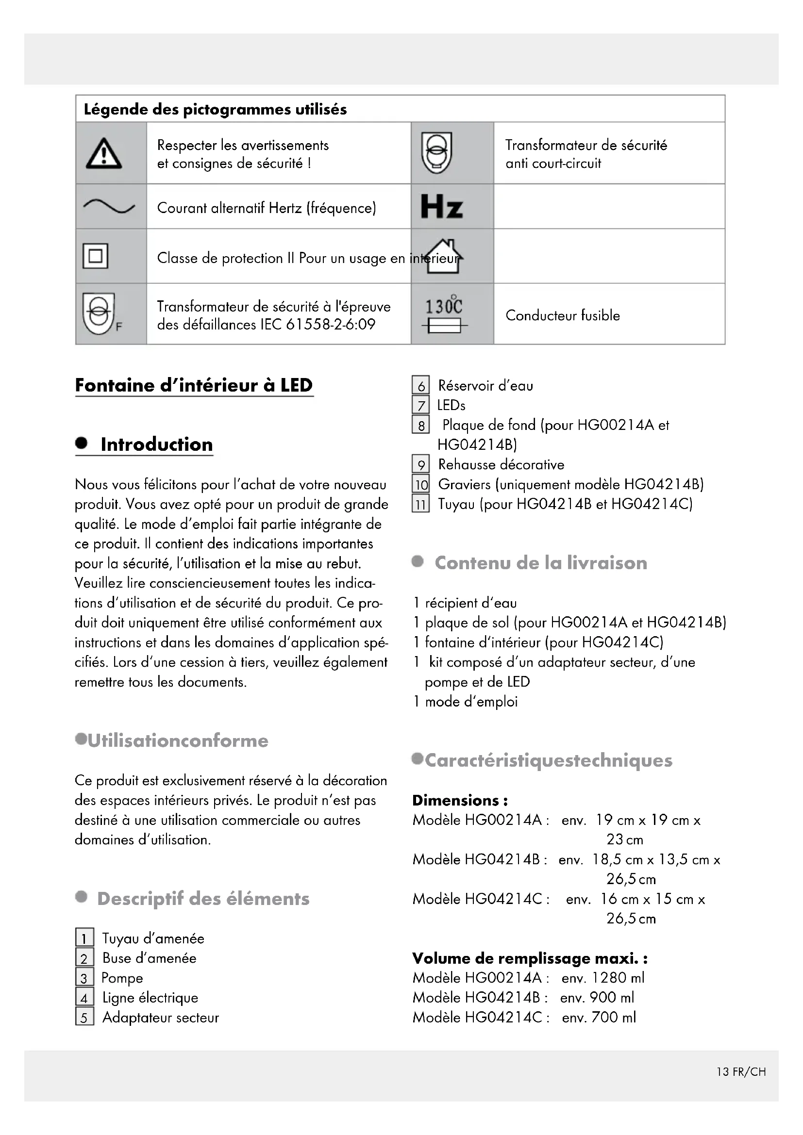 Tuyau (pour HG04214B et HG04214C) Contenu de la livraison 1 récipient d‘eau 1 plaque de sol (pour HG00214A et HG04214B) 1 fontaine d‘intérieur (pour HG04214C) 1 kit composé d‘un adaptateur secteur, d‘une pompe et de LED 1 mode d‘emploi Caractéristiques techniques Dimensions: Modèle HG00214A : env. 19 cm x 19 cm x 23 cm Modèle HG04214B : env. 18,5 cm x 13,5 cm x 26,5 cm Modèle HG04214C : env. 16 cm x 15 cm x 26,5 cm Volume de remplissage maxi. : Modèle HG00214A : env. 1280 ml Modèle HG04214B : env. 900 ml Modèle HG04214C : env. 700 ml14 FR/CH Température maxi. du liquide à pomper : 35 °C Tension de service de la pompe : 12 V