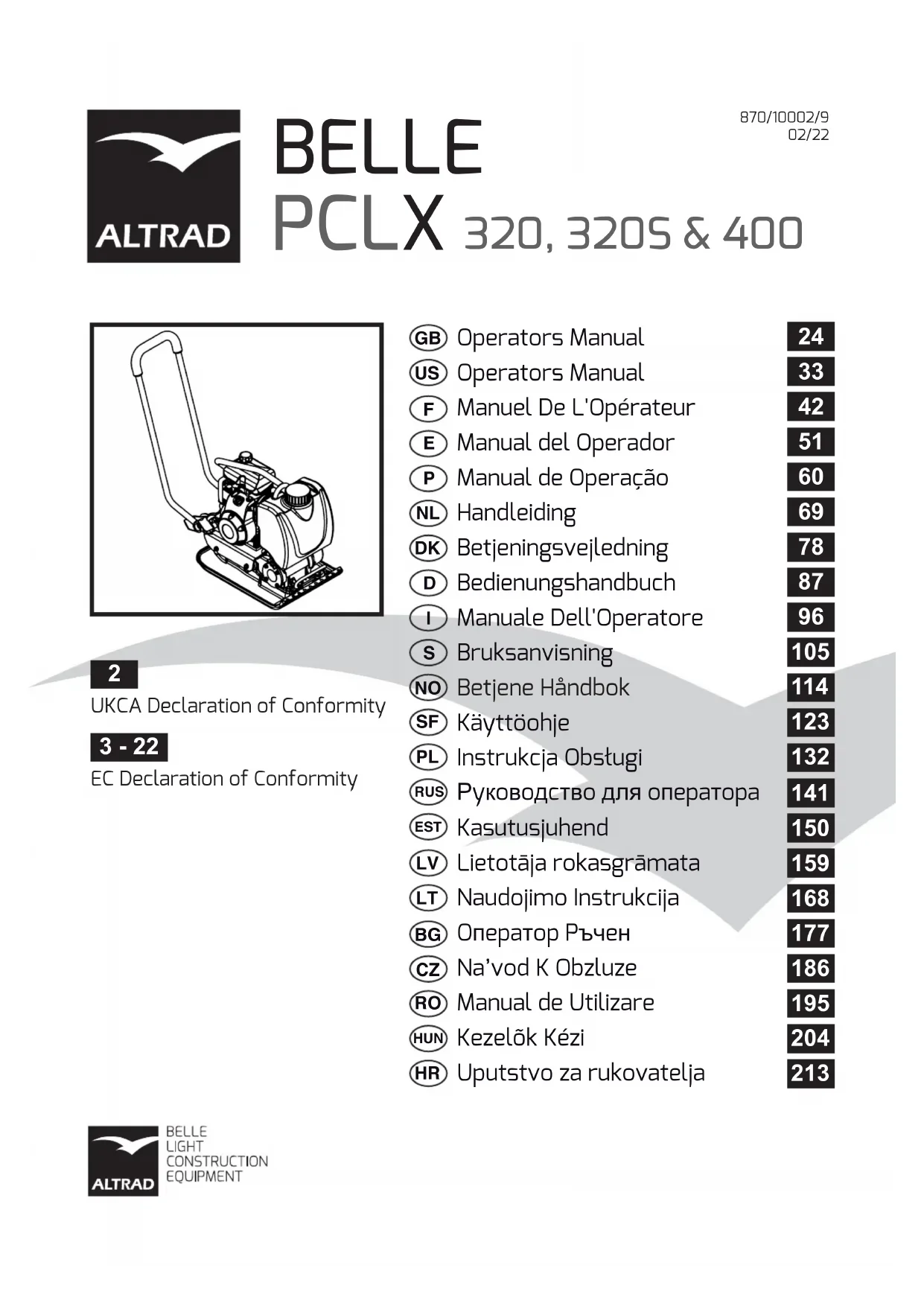 Déclaration CE de conformité (DdC) Nous, Altrad Belle, Sheen, Nr. Buxton, Derbyshire, SK17 0EU, GB déclarons que la DdC est émisse sous notre seule responsabilité et qu'elle appartient au(x) produit(s) suivants: Directeur GénéralAu nom de Altrad BelleSheen, Derbyshire, R.-U. Ray Neilson Signée par:866/10000/0_F Voir page 3 pour cette information TYPE DE PRODUIT.....................................MODÈLE......................................................No DE SÉRIE...............................................DATE DE FABRICATION.............................NIVEAU DE PUISSANCE ACOUSTIQUEMESURÉ /........................................................................(GARANTI)POIDS .......................................................... Objet de la déclaration: Single-direction plate compactor used for soil compaction on new developments, repairs and maintenance jobs with large aggregates, cohesive material or moist content. L'objet de la déclaration décrite ci-dessus est conforme à la législation de l'Union européenne en matière d'harmonisation: - 2006/42/EC Directive relative aux machines - 2000/14/EC Émissions sonores - matériels utilisés à l'extérieur Les normes et les spécifications techniques harmonisées suivantes ont été appliquées: - EN ISO 12100:2010 Sécurité des machines - EN 500-4:2011 Machines mobiles de construction de routes. Sécurité. - ISO 3744:2010 Acoustique - Détermination des niveaux de puissance acoustique et des niveaux d'énergie acoustique des sources de bruit à l'aide de la pression acoustique VINÇOTTE nv/sa (NB0026) a effectué un contrôle interne de la production avec évaluation de la documentation technique et vérification périodique conformément à l'annexe VI de la directive 2000/14/CE Les dossiers techniques sont détenus par Hugues Menager à l'adresse suivante:- Altrad (Group Holding), 125 Rue du Mas Carbonnier, 34000, Montpellier, France. Lieu de la déclaration:- Sheen, Nr. Buxton, Derbyshire, SK17 0EU,