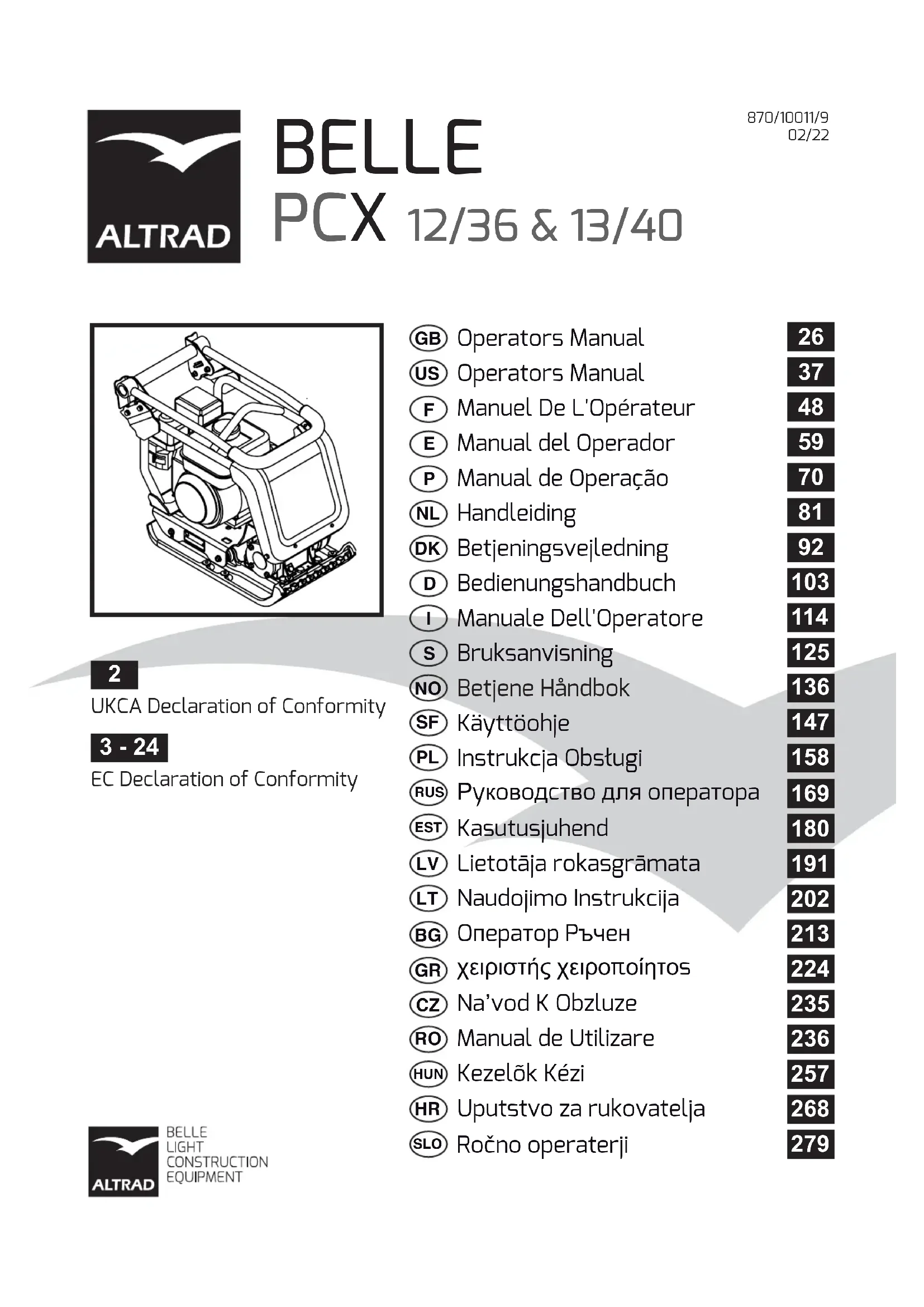 Déclaration CE de conformité (DdC) Nous, Altrad Belle, Sheen, Nr. Buxton, Derbyshire, SK17 0EU, GB déclarons que la DdC est émisse sous notre seule responsabilité et qu'elle appartient au(x) produit(s) suivants: Directeur GénéralAu nom de Altrad BelleSheen, Derbyshire, R.-U. Ray Neilson Signée par:866/10000/0_F Voir page 3 pour cette information TYPE DE PRODUIT.....................................MODÈLE......................................................No DE SÉRIE...............................................DATE DE FABRICATION.............................NIVEAU DE PUISSANCE ACOUSTIQUEMESURÉ /........................................................................(GARANTI)POIDS .......................................................... Objet de la déclaration: Single-direction plate compactor used for soil compaction on new developments, repairs and maintenance jobs with large aggregates, cohesive material or moist content. L'objet de la déclaration décrite ci-dessus est conforme à la législation de l'Union européenne en matière d'harmonisation: - 2006/42/EC Directive relative aux machines - 2000/14/EC Émissions sonores - matériels utilisés à l'extérieur Les normes et les spécifications techniques harmonisées suivantes ont été appliquées: - EN ISO 12100:2010 Sécurité des machines - EN 500-4:2011 Machines mobiles de construction de routes. Sécurité. - ISO 3744:2010 Acoustique - Détermination des niveaux de puissance acoustique et des niveaux d'énergie acoustique des sources de bruit à l'aide de la pression acoustique VINÇOTTE nv/sa (NB0026) a effectué un contrôle interne de la production avec évaluation de la documentation technique et vérification périodique conformément à l'annexe VI de la directive 2000/14/CE Les dossiers techniques sont détenus par Hugues Menager à l'adresse suivante:- Altrad (Group Holding), 125 Rue du Mas Carbonnier, 34000, Montpellier, France. Lieu de la déclaration:- Sheen, Nr. Buxton, Derbyshire, SK17 0EU,