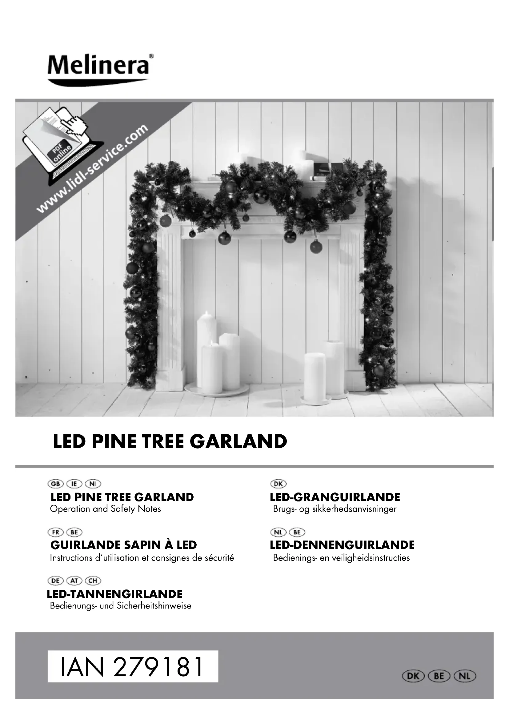 TION! Pour des raisons relevant de la sécurité électrique, ne jamais nettoyer l’appareil avec de l’eau ou d’autres liquides, et ne jamais le plonger dans l’eau. Pour le nettoyage, utilisez uniquement une brosse douce ou un pinceau. Traitement des déchets L’emballage se compose exclusivement de matières recyclables, qui peuvent être mises au rebut dans les déchetteries lo- cales. Les possibilités de recyclage des produits usés sont à demander auprès de votre municipalité. Pour le respect de l‘environnement, lorsque vous n‘utilisez plus votre produit, ne le jetez pas avec les ordures ména- gères, mais entreprenez un recyclage adapté. Pour obtenir des renseignements et des horaires d‘ouverture concernant les points de collecte, vous pouvez contacter votre administration locale. Garantie et service après-vente Remarque: vous bénéficiez d‘une garantie de 36mois à partir de la date d‘achat. L’appareil a été fabriqué avec soin et consciencieusement contrôlé avant sa livraison. Si cependant vous deviez consta- ter des défauts de conception ou matériels pendant le temps de garantie, veuillez contacter rapidement votre revendeur. Les dommages issus d‘une mauvaise manipulation, du non-respect de la notice d‘utilisation ou de l‘in- tervention d‘une personne non autorisée sont exclus de la garantie. La majorité des dysfonctionnements sont dus à une mauvaise utilisation. Veuillez donc consulter d‘abord la notice d‘utilisation à l‘appari- tion d‘un dysfonctionnement. Contactez le SAV d‘Uni-Elektra GmbH pour un éven- tuel retour de la marchandise. Le produit ne peut être repris qu‘après accord. Les envois en port dû ne sont pas acceptés. La prise sous garantie ne prolonge pas ni ne renouvelle la garantie de 36 mois. Adresse du service après-vente Uni-Elektra GmbH Kirchstr. 48 72145 Hirrlingen / Allemagne Tél.: +49 (0) 7478 / 91385-0 service@uni-elektra.de IAN 279181 Veuillez conserver le ticket de caisse et la référence de l’article (par ex. IAN 12345) à titre de preuve d’achat pour toute demande. Fabricant Uni-Elektra GmbH Kirchstr. 48 72145 Hirrlingen / Allemagne1617 NL/BE LED-dennenguirlande Inleiding Hartelijk gefeliciteerd met de aankoop van uw nieuwe product. U heeft voor een hoogwaardig product gekozen. De gebruiksaanwijzing is een deel van het product. Deze bevat belangrijke aanwijzingen voor veilig- heid, gebruik en verwijdering. Maakt U zich voor de ingebruikname van het product met alle bedie- nings- en veiligheidsvoorschriften vertrouwd. Gebruik het apparaat alleen zoals beschreven en voor de aangegeven toepassingsgebieden. Overhandig alle documenten bij doorgifte van het product aan derden. Correct gebruik Dit product is geschikt als lichtdecoratie binnens- en buitenshuis. Alle veranderingen aan het apparaat zijn niet doelmatig en kunnen aanzienlijke ongeval- lenrisico‘s met zich meebrengen. De fabrikant is niet aansprakelijk voor schade voortvloeiend uit niet doelmatig gebruik. Dit apparaat is niet bedoeld voor commercieel gebruik. Beschrijving van de onderdelen