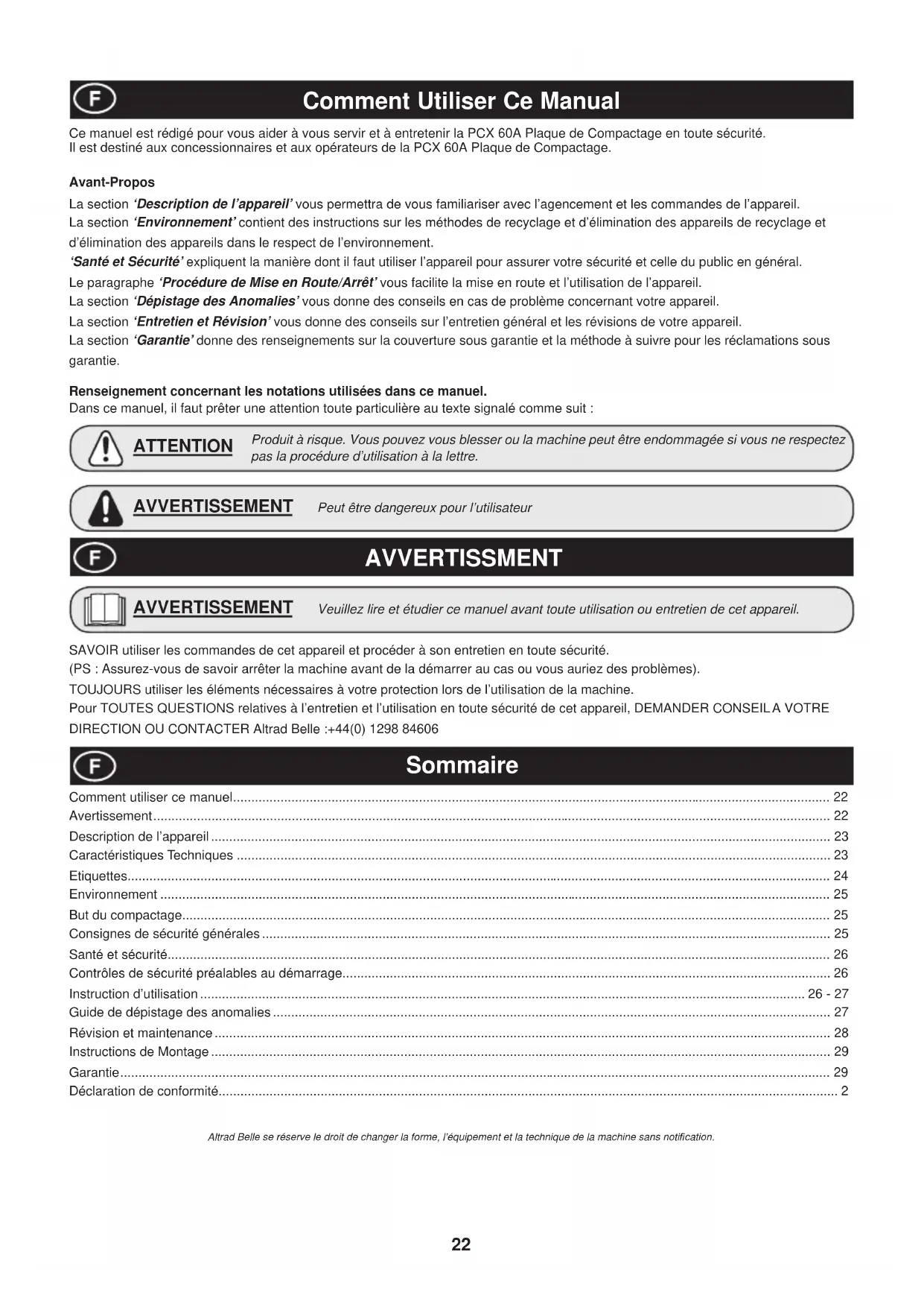 - Comment Utiliser Ce Manual AVVERTISSMENT Sommaire Peut être dangereux pour l’utilisateur AVVERTISSEMENT Produit à risque. Vous pouvez vous blesser ou la machine peut être endommagée si vous ne respectez pas la procédure d’utilisation à la lettre. ATTENTION SAVOIR utiliser les commandes de cet appareil et procéder à son entretien en toute sécurité. (PS : Assurez-vous de savoir arrêter la machine avant de la démarrer au cas ou vous auriez des problèmes). TOUJOURS utiliser les éléments nécessaires à votre protection lors de l’utilisation de la machine. Pour TOUTES QUESTIONS relatives à l’entretien et l’utilisation en toute sécurité de cet appareil, DEMANDER CONSEIL A VOTRE DIRECTION OU CONTACTER Altrad Belle :+44(0) 1298 84606 Altrad Belle se réserve le droit de changer la forme, l’équipement et la technique de la machine sans noti¿ cation. Ce manuel est rédigé pour vous aider à vous servir et à entretenir la PCX 60A Plaque de Compactage en toute sécurité. Il est destiné aux concessionnaires et aux opérateurs de la PCX 60A Plaque de Compactage. Avant-Propos La section ‘Description de l’appareil’ vous permettra de vous familiariser avec l’agencement et les commandes de l’appareil. La section ‘Environnement’ contient des instructions sur les méthodes de recyclage et d’élimination des appareils de recyclage et d’élimination des appareils dans le respect de l’environnement. ‘Santé et Sécurité’ expliquent la manière dont il faut utiliser l’appareil pour assurer votre sécurité et celle du public en général. Le paragraphe ‘Procédure de Mise en Route/Arrêt’ vous facilite la mise en route et l’utilisation de l’appareil. La section ‘Dépistage des Anomalies’ vous donne des conseils en cas de problème concernant votre appareil. La section ‘Entretien et Révision’ vous donne des conseils sur l’entretien général et les révisions de votre appareil. La section ‘Garantie’ donne des renseignements sur la couverture sous garantie et la méthode à suivre pour les réclamations sous garantie. Renseignement concernant les notations utilisées dans ce manuel. Dans ce manuel, il faut prêter une attention toute particulière au texte signalé comme suit : Comment utiliser ce manuel p. 22
