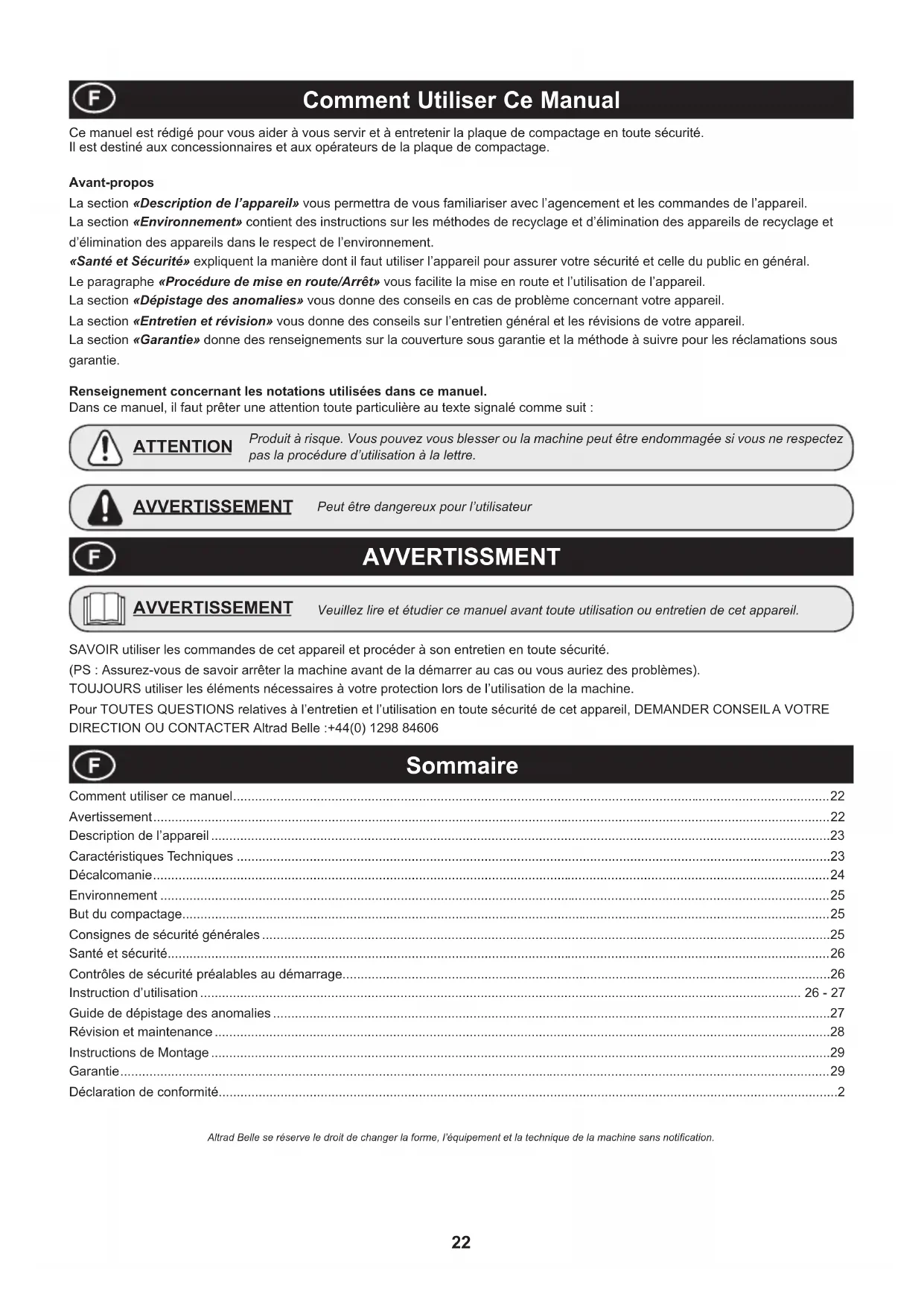 - Engine spark plug Altrad Belle and/or their recognised agents, directors, employees or insurers will not be held liable for consequential or other damages, losses or expenses in connection with or by reason of or the inability to use the machine for any purpose. Warranty Claims All warranty claims should ¿ rstly be directed to Altrad Belle, either by telephone, by Fax, by Email, or in writing. For warranty claims: Tel: +1 540.345.5090 Fax: +1 540.345.5090 Email : BelleGroupInc@aol.com Write to: Altrad Belle Inc, 3959 Electric Road, Roanoke, Suite 360, VA, 24018, USA Warranty Registration: In the bid for ALTRAD Belle to become greener and more eco friendly, we have now introduced online Warranty registration. To access the registration page of our website, please use the following address:- http://www.bellegroup.com/index.php?p=warranty_registration Alternatively, please scan the adjacent QR Code (Quick Response Code) using your smartphone to access the registration page. Warranty22 Comment Utiliser Ce Manual AVVERTISSMENT Sommaire Peut être dangereux pour l’utilisateur AVVERTISSEMENT Produit à risque. Vous pouvez vous blesser ou la machine peut être endommagée si vous ne respectez pas la procédure d’utilisation à la lettre. ATTENTION SAVOIR utiliser les commandes de cet appareil et procéder à son entretien en toute sécurité. (PS : Assurez-vous de savoir arrêter la machine avant de la démarrer au cas ou vous auriez des problèmes). TOUJOURS utiliser les éléments nécessaires à votre protection lors de l’utilisation de la machine. Pour TOUTES QUESTIONS relatives à l’entretien et l’utilisation en toute sécurité de cet appareil, DEMANDER CONSEIL A VOTRE DIRECTION OU CONTACTER Altrad Belle :+44(0) 1298 84606 Altrad Belle se réserve le droit de changer la forme, l’équipement et la technique de la machine sans noti¿ cation. Ce manuel est rédigé pour vous aider à vous servir et à entretenir la plaque de compactage en toute sécurité. Il est destiné aux concessionnaires et aux opérateurs de la plaque de compactage. Avant-propos La section «Description de l’appareil» vous permettra de vous familiariser avec l’agencement et les commandes de l’appareil. La section «Environnement» contient des instructions sur les méthodes de recyclage et d’élimination des appareils de recyclage et d’élimination des appareils dans le respect de l’environnement. «Santé et Sécurité» expliquent la manière dont il faut utiliser l’appareil pour assurer votre sécurité et celle du public en général. Le paragraphe «Procédure de mise en route/Arrêt» vous facilite la mise en route et l’utilisation de l’appareil. La section «Dépistage des anomalies» vous donne des conseils en cas de problème concernant votre appareil. La section «Entretien et révision» vous donne des conseils sur l’entretien général et les révisions de votre appareil. La section «Garantie» donne des renseignements sur la couverture sous garantie et la méthode à suivre pour les réclamations sous garantie. Renseignement concernant les notations utilisées dans ce manuel. Dans ce manuel, il faut prêter une attention toute particulière au texte signalé comme suit : Comment utiliser ce manuel ....................................................................................................................................................................22 Avertissement ..........................................................................................................................................................................................22 Description de l’appareil ..........................................................................................................................................................................23 Caractéristiques Techniques ...................................................................................................................................................................23 Décalcomanie ..........................................................................................................................................................................................24 Environnement ........................................................................................................................................................................................25 But du compactage..................................................................................................................................................................................25 Consignes de sécurité générales ............................................................................................................................................................25 Santé et sécurité......................................................................................................................................................................................26 Contrôles de sécurité préalables au démarrage......................................................................................................................................26 Instruction d’utilisation ..................................................................................................................................................................... 26 - 27 Guide de dépistage des anomalies .........................................................................................................................................................27 Révision et maintenance .........................................................................................................................................................................28 Instructions de Montage ..............................................................................................................................................................