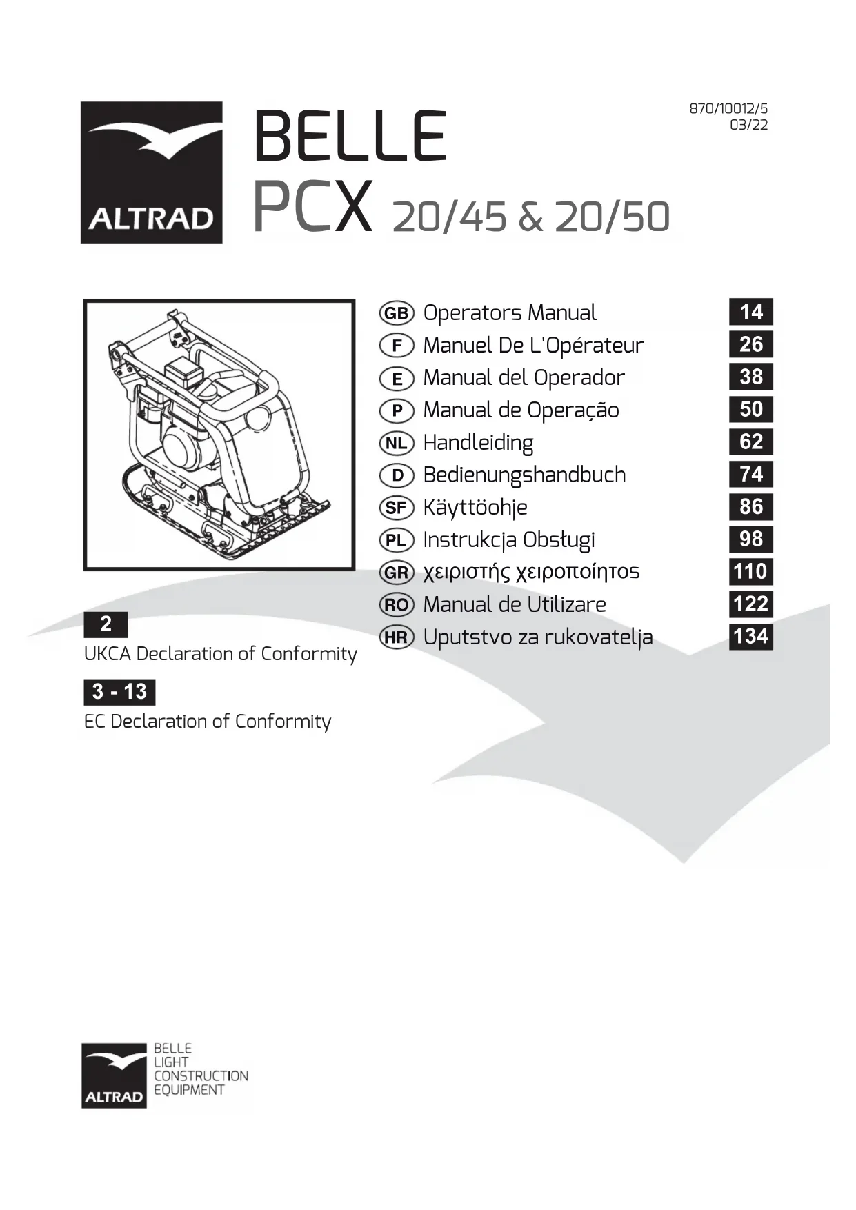 Déclaration CE de conformité (DdC) Nous, Altrad Belle, Sheen, Nr. Buxton, Derbyshire, SK17 0EU, GB déclarons que la DdC est émisse sous notre seule responsabilité et qu'elle appartient au(x) produit(s) suivants: Directeur GénéralAu nom de Altrad BelleSheen, Derbyshire, R.-U. Ray Neilson Signée par:866/10000/0_F Voir page 3 pour cette information TYPE DE PRODUIT.....................................MODÈLE......................................................No DE SÉRIE...............................................DATE DE FABRICATION.............................NIVEAU DE PUISSANCE ACOUSTIQUEMESURÉ /........................................................................(GARANTI)POIDS .......................................................... Objet de la déclaration: Single-direction plate compactor used for soil compaction on new developments, repairs and maintenance jobs with large aggregates, cohesive material or moist content. L'objet de la déclaration décrite ci-dessus est conforme à la législation de l'Union européenne en matière d'harmonisation: - 2006/42/EC Directive relative aux machines - 2000/14/EC Émissions sonores - matériels utilisés à l'extérieur Les normes et les spécifications techniques harmonisées suivantes ont été appliquées: - EN ISO 12100:2010 Sécurité des machines - EN 500-4:2011 Machines mobiles de construction de routes. Sécurité. - ISO 3744:2010 Acoustique - Détermination des niveaux de puissance acoustique et des niveaux d'énergie acoustique des sources de bruit à l'aide de la pression acoustique VINÇOTTE nv/sa (NB0026) a effectué un contrôle interne de la production avec évaluation de la documentation technique et vérification périodique conformément à l'annexe VI de la directive 2000/14/CE Les dossiers techniques sont détenus par Hugues Menager à l'adresse suivante:- Altrad (Group Holding), 125 Rue du Mas Carbonnier, 34000, Montpellier, France. Lieu de la déclaration:- Sheen, Nr. Buxton, Derbyshire, SK17 0EU,