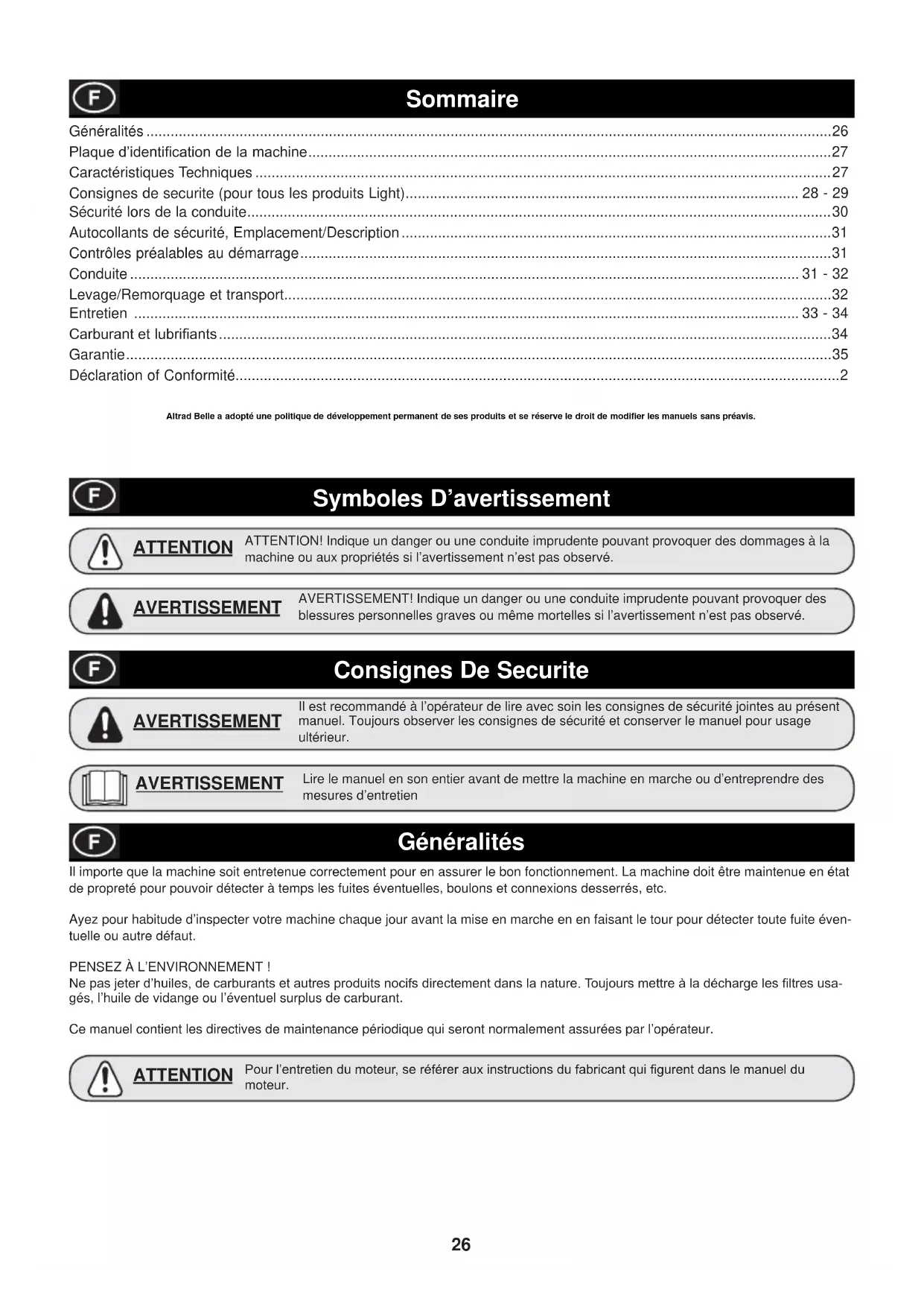 = 8.728 Consignes De Securite Symboles /HVLJQHGHVPRWV'$1*(5HW$77(17,21XWLOLVpVGDQVOHVFRQVLJQHVGHVpFXULWpRQWOHVGp¿QLWLRQVVXLYDQWHV Régles de sécurité importantes: ATTENTION! Indique un danger ou une conduite imprudente pouvant provoquer des dommages à la machine ou aux propriétés si l’avertissement n’est pas observé. ATTENTION AVERTISSEMENT! Indique un danger ou une conduite imprudente pouvant provoquer des blessures personnelles graves ou même mortelles si l’avertissement n’est pas observé. AVERTISSEMENT &HVUHFRPPDQGDWLRQVVRQWWLUpHVGHVQRUPHVLQWHUQDWLRQDOHVGHVpFXULWp 9RXVGHYH]DXVVLREVHUYHUOHVUqJOHVGHVpFXULWpORFDOHVHQYLJXHXU/LVH]DWWHQWLYHPHQWWRXWHVOHVLQVWUXFWLRQVDYDQWGHPHWWUH la machine en marche. Rangez les instructions dans un endroit protégé. 'HVSDQQHDX[HWDXWRFROODQWVLQGLTXDQWOHVFRQVLJQHVGHVpFXULWpLQSRUWDQWHVVRQWIRXUQLVDYHFFKDTXHPDFKLQH$VVXUH]YRXV qu’ils soient toujours lisibles. Les références pour commander de nouveaux autocollants se trou vent dans la liste des pièces de rechange. /¶XWLOLVDWLRQGHODPDFKLQHHWVHVDFFHVVRLUHVHVWOLPLWpHjO¶DSSOLFDWLRQVSpFL¿pHGDQVODGRFXPHQWDWLRQFRQFHUQDQWOHSURGXLW 3RXUGHVUDLVRQVGHVpFXULWpSURSUHVDXSURGXLWODPDFKLQHQHGRLWSDVrWUHPRGL¿pHHQDXFXQHPDQLqUH 5HPSODFHUOHVSLpFHVHQGRPPDJpHVLPPpGLDWHPHQW5HPSODFHUWRXWHVOHVSLqFHVG¶XVXUHjWHPSV Soyez attentif Prêter toujours attention à ce que vous faîtes, et utilisez votre bon sens. Ne pas utiliser une machine si vous êtes fatiqué ou sous O¶LQÀXHQFHGHPpGLFDPHQWVG¶DOFRRORXG¶DXWUHVVXEVWDQFHVTXLSHXYHQWDIIHFWHUYRWUHYLVLRQYRVUpDFWLRQVRXYRWUHMXJHPHQW Equipement de sécurité 5pJOHVGHVpFXULWpLPSRUWDQWHV/DPDFKLQHQHGRLWSDVrWUHPRGL¿pHVDQVO¶DXWRULVDWLRQ préalable du constructeur. N’utiliser que des pièces d’origine. N’utilisez que des accessoires UHFRPPDQGpVSDU%HOOH6LOHVPRGL¿FDWLRQVHIIHFWXpHVQHVRQWSDVDSSURXYpHVSDU%HOOH celles-ci pourraient entraîner des blessures sérieuses pour vous-même ou pour d’autres personnes. AVERTISSEMENT S’exposer longtemps à un bruit très fort sans protection pour les oreilles peut endommager votre ouîe. AVERTISSEMENT L’opérateur et autres personnes se trouvant dans ou à proximité de la zone de travail devront porter: FDVTXHV GHVOXQHWWHVSURWHFWULFHV SURWHFWLRQSRXUOHVRUHLOOHV PDVTXHjSRXVVLqUHHQDWPRVSKqUH SRXVVLHUHXVH GHVYrWHPHQWVGHVpFXULWp JDQWVGHSURWHFWLRQ FKDXVVXUHVGHVpFXULWp Evitez de porter des vêtements trop lâches qui pourraient être pris dans la machine. Si vous avez des cheveux longs, couvrez les. Les vibrations des machines à conducteur accompagnant sont transmises aux mains par l’intermédiaire du timon. Les machines Belle possèdent une conception de poignée qui absorbe une grande partie des vibrations émises par la machine. Les vibrations ne sont pas éliminées entièrement, mais la durée d’utilisation du matériel peut être prolongée sans risque de blessure. Aire de travail 1HSDVXWLOLVHUODPDFKLQHjSUR[LPLWpGHPDWLpUHVLQÀDPPDEOHVRXGDQVGHVHQYLURQQHPHQWVH[SORVLIV'HVpWLQFHOOHVSHXYHQWrWUH pPLVHVSDUODFRQGXLWHG¶pFKDSSHPHQWHWFUpHUO¶LQFHQGLHDX[PDWLqUHVLQÀDPPDEOHV/RUVG¶XQDUUrWWHPSRUDLUHRXDSUqVDYRLU¿QL GHWUDYDLOOHODPDFKLQHQHGRLWSDVVWDWLRQQHUSUqVGHPDWLqUHVLQÀDPPDEOHV/DFRQGXLWHG¶pFKDSSHPHQWFKDXGHSHXWrWUHjO¶RULJLQH d’un incendie. Assurez-vous qu’il n’y ait pas de personnes à l’intérieur de l’aire de travail quand la machine fonctionne. Maintenez l’aire de travail propre et libre d’objets encombrants. Stocker la machine dans un endroit sûr, hors de portée des enfants, et de préférence dans un endroit fermé à clé. Une exposition prolongée aux vibrations risque de provoquer des lésions au niveau des mains, des doigts ou des poignets. Ne pas utiliser la machine si vous êtes géné. Consulter un médecin avant de reprendre le travail avec la machine. AVERTISSEMENT29 N’utilisez la machine que pour l’usage pour lequel elle a été conque. Sachez comment arrêter la machine en cas d’urgence. Remplissage carburant (Essence/diesel) Lors du remplissage, éloignez vous de tout objet qui peut être chaud ou émettre des étincelles. Attendre que la machine refroidisse avant de remplir le réservoir. Remplir le réservoir à 3 m au moins de l’endroit où l’on compte utiliser la machine pour éviter tout risque d’incendie. Eviter de répandre au sol l’essence, le gasoil ou l’huile. Protéger vos mains contre le contact avec l’essence, le gasoil ou O¶KXLOH2XYULUOHERXFKRQGXUpVHUYRLUOHQWHPHQWD¿QGHUHOkFKHUODSUHVVLRQHYHQWXHOOHjO¶LQWpULHXUGHFHOXLFL1HSDVWURSUHPSOLUOH réservoir. Inspecter régulierément la machine pour déceler les fuiteséventuelles. Ne pas utiliser une machine qui présente des fuites de carburant. Mise en marche WRXWHVOHVSRLJQpHVQHFRPSRUWHQWSDVGHJUDLVVHG¶KXLOHRXG¶LPSXUHWpV ODPDFKLQHQHSUpVHQWHSDVGHGpIDXWpYLGHQW WRXVOHVGLVSRVLWLIVGHVpFXULWpVRLHQWRSpUDWLRQQHOV WRXVOHVOHYLHUVGHFRPPDQGHVRLHQWHQSRVLWLRQQHXWUH Démarrer la machine selon les instructions données dans le manuel d’utilisation. Fonctionnement Ne toucher ni le moteur, ni la conduite d’échappement ni l’élément exentrique de la machine. Ces organes deviennent très chauds pendant le fonctionnement et peuvent causer des brûlures ou des blessures. Ne pas toucher les courroies ni les parties tournantes pendant le fonctionnement. Stationnement Stationner la machine sur un terrain aussi plat et ferme que possible. Avant de laisser la machine: PHWWUHOHIUHLQjPDLQ DUUrWHUOHPRWHXUHWHQOHYHUODFOpGHFRQWDFW Chargement / déchargement /HSRLQWG¶LQÀDPPDWLRQGHO¶HVVHQFHHVWH[WUqPHPHQWEDVHWSHXWrWUHH[SORVLIGDQVFHUWDLQHV situations. Ne pas fumer. Assurer vous que l’aire de travail est bien aéré. AVERTISSEMENT Eloignez vos pieds de la machine AVERTISSEMENT La machine ne doit pas fonctionner dans des endroits mal aérés. Il y a risque de dégagement de monoxyde de carbone. AVERTISSEMENT Faire toujours attention en conduisant la machine sur des pentes. Lorsque l’on travaille sur des pentes ou sur terrain irreguiler, le conducteur de