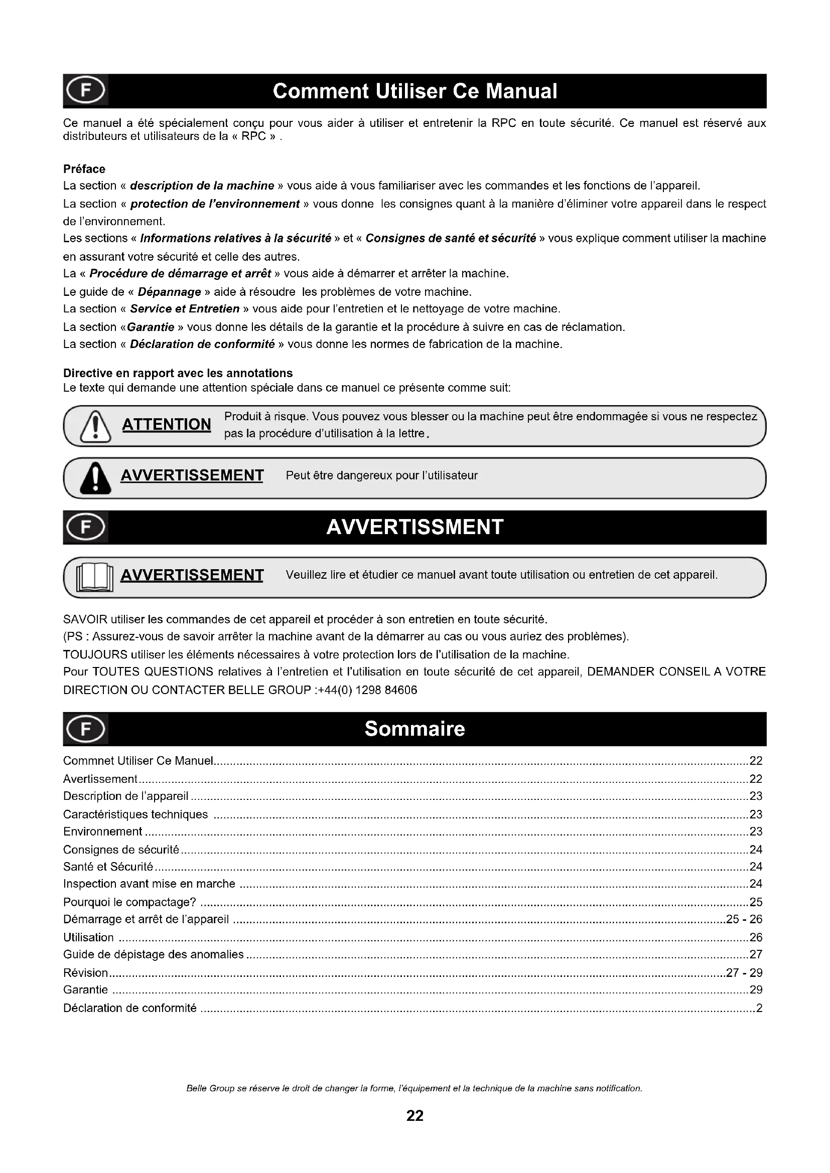 - Engine Spark Plug Belle Group and/or their recognised agents, directors, employees or insurers will not be held liable for consequential or other damages, losses or expenses in connection with or by reason of or the inability to use the machine for any purpose. Warranty Claims All warranty claims should È rstly be directed to Belle Group or Belle Group Inc., either by telephone, by Fax, by E-mail, or in writing. For Warranty claims: Belle Group Inc. 3959 Electric Road, Roanoke VA, 24018 USA Tel: +1 540.345.5090 Fax: +1 540.345.5091 E-mail: Bellegroupinc@aol.com22 Commnet Utiliser Ce Manuel....................................................................................................................................................................22 Avertissement ...........................................................................................................................................................................................22 Description de l’appareil ...........................................................................................................................................................................23 Caractéristiques techniques ....................................................................................................................................................................23 Environnement .........................................................................................................................................................................................23 Consignes de sécurité ..............................................................................................................................................................................24 Santé et Sécurité ......................................................................................................................................................................................24 Inspection avant mise en marche ............................................................................................................................................................24 Pourquoi le compactage? ........................................................................................................................................................................25 Démarrage et arrêt de l’appareil .......................................................................................................................................................25 - 26 Utilisation .................................................................................................................................................................................................26 Guide de dépistage des anomalies ..........................................................................................................................................................27 Révision .............................................................................................................................................................................................27 - 29 Garantie ...................................................................................................................................................................................................29 Déclaration de conformité ..........................................................................................................................................................................2 Comment Utiliser Ce Manual AVVERTISSMENT Sommaire Ce manuel a été spécialement conçu pour vous aider à utiliser et entretenir la RPC en toute sécurité. Ce manuel est réservé aux distributeurs et utilisateurs de la « RPC » . Préface La section « description de la machine » vous aide à vous familiariser avec les commandes et les fonctions de l’appareil. La section « protection de l’environnement » vous donne les consignes quant à la manière d’éliminer votre appareil dans le respect de l’environnement. Les sections « Informations relatives à la sécurité » et « Consignes de santé et sécurité » vous explique comment utiliser la machine en assurant votre sécurité et celle des autres. La « Procédure de démarrage et arrêt » vous aide à démarrer et arrêter la machine. Le guide de « Dépannage » aide à résoudre les problèmes de votre machine. La section « Service et Entretien » vous aide pour l’entretien et le nettoyage de votre machine. La section «Garantie » vous donne les détails de la garantie et la procédure à suivre en cas de réclamation. La section « Déclaration de conformité » vous donne les normes de fabrication de la machine. Directive en rapport avec les annotations Le texte qui demande une attention spéciale dans ce manuel ce présente comme suit: Peut être dangereux pour l’utilisateur AVVERTISSEMENT Produit à risque. Vous pouvez vous blesser ou la machine peut être endommagée si vous ne respectez pas la procédure d’utilisation à la lettre