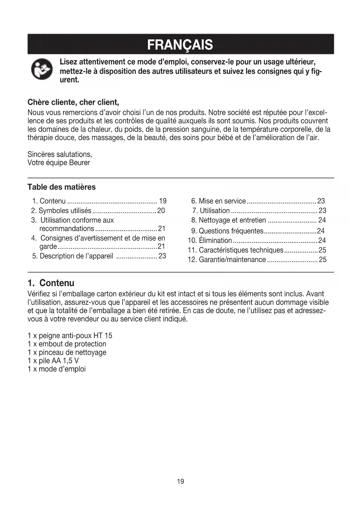 Vérifiez si l’emballage carton extérieur du kit est intact et si tous les éléments sont inclus. Avant l’utilisation, assurez-vous que l’appareil et les accessoires ne présentent aucun dommage visible et que la totalité de l’emballage a bien été retirée. En cas de doute, ne l’utilisez pas et adressez- vous à votre revendeur ou au service client indiqué. 1 x peigne anti-poux HT15 1 x embout de protection 1 x pinceau de nettoyage 1 x pile AA 1,5V 1 x mode d’emploi Table des matières20