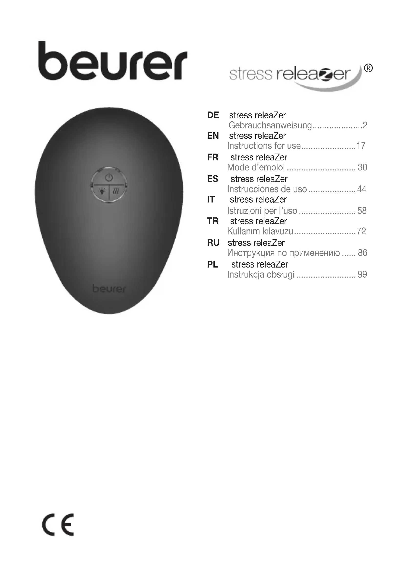 - Vous ne devez en aucun cas ouvrir ou réparer l’appareil; le bon fonctionnement de l’appareil ne serait plus assuré. Le non-respect de cette consigne annulera la garantie. Chère cliente, cher client, Nous vous remercions d’avoir choisi l’un de nos produits. Notre société est réputée pour l’excellence de ses produits et les contrôles de qualité appro- fondis auxquels ils sont soumis dans les domaines suivants: chaleur, thé- rapie douce, diagnostic de pression artérielle, contrôle de poids, massage, beauté, purification d’air et bébé. Sincères salutations, Votre équipe Beurer Contenu 1 x stress releaZer 1 x câble micro USB 1 x adaptateur secteur Table des matières