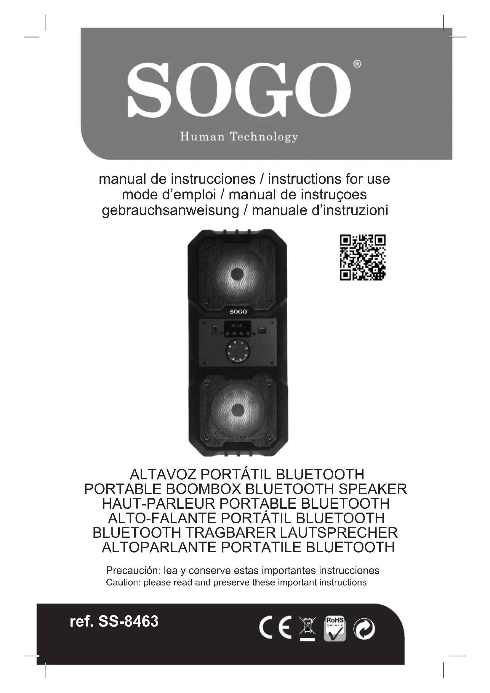 Bluetooth Allumez le haut-parleur, il passera directement en mode Bluetooth. Après avoir couplé l’appareil, ilpeutlirelamusique.Appuyezbrièvementsur►pourlire/mettreenpause.Appuyez brièvement sur et pour aller à Précédent et Suivant. Appuyez sur les boutons - et + pour baisser et augmenter le volume. Carte USB / TF InsérezlamémoireashUoulacarteMicro-TFdanslafenteUSB/TF.Illiraautomatiquementla musiqueauformatMP3.Appuyezsur►pourlire/mettreenpause.Appuyezbrièvementsur et pour aller à Précédent et Suivant. Appuyez longuement sur - et + pour baisser et augmenter le volume. Mise en charge Veuillez utiliser le câble de charge d’origine pour charger, La LED rouge est allumée lors de la charge. AUX-IN AUX-IN: En utilisant le câble audio dans la prise AUX, appuyez sur M pour passer en mode AUX- IN. Appuyez longuement sur et pour baisser et augmenter le volume. Sous AUX-IN, Prev et Next ne peuvent pas être décalés par le haut-parleur, mais ils peuvent être contrôlés par un périphérique de connexion. RADIO FM Appuyez sur ►ll pour rechercher automatiquement les chaînes FM. Cette opération va balayer toutes les stations FM et les pré-enregistrer en mémoire. La procédure de numérisation prendra plusieurs minutes et ne doit pas être interrompue. Une fois terminé, vous pouvez appuyer brièvement sur ou ppour avancer ou reculer. Appuyez longuement sur ou pour baisser ou augmenter le volume.8 español english français portuguese deutsch italiano Este manual de instruções também pode ser baixado da nossa página web www.sogo.es Regras de segurança