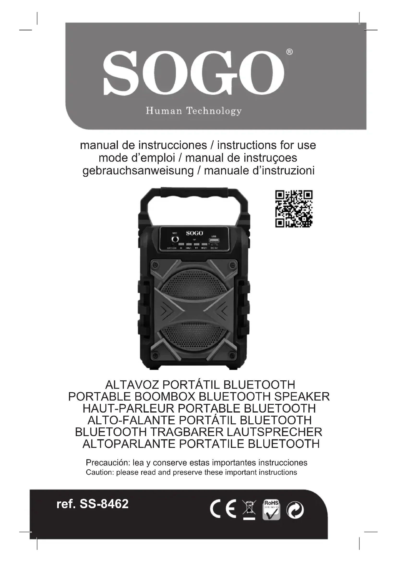 Bluetooth Allumez le haut-parleur, il passera directement en mode Bluetooth. Après avoir couplé l’appareil, ilpeutlirelamusique.Appuyezbrièvementsur►pourlire/mettreenpause.Appuyez brièvement sur et pour aller à Précédent et Suivant. Appuyez sur les boutons - et + pour baisser et augmenter le volume. Carte USB / TF (32 GB) InsérezlamémoireashUoulacarteMicro-TFdanslafenteUSB/TF.Illiraautomatiquementla musiqueauformatMP3.Appuyezsur►pourlire/mettreenpause.Appuyezbrièvementsur et pour aller à Précédent et Suivant. Appuyez longuement sur - et + pour baisser et augmenter le volume. Mise en charge Veuillez utiliser le câble de charge d’origine pour charger, La LED rouge est allumée lors de la charge. RADIO FM Appuyez sur ►ll pour rechercher automatiquement les chaînes FM. Cette opération va balayer toutes les stations FM et les pré-enregistrer en mémoire. La procédure de numérisation prendra plusieurs minutes et ne doit pas être interrompue. Une fois terminé, vous pouvez appuyer brièvement sur ou ppour avancer ou reculer. Appuyez longuement sur ou pour baisser ou augmenter le volume.8 español english français portuguese deutsch italiano Este manual de instruções também pode ser baixado da nossa página web www.sogo.es Regras de segurança