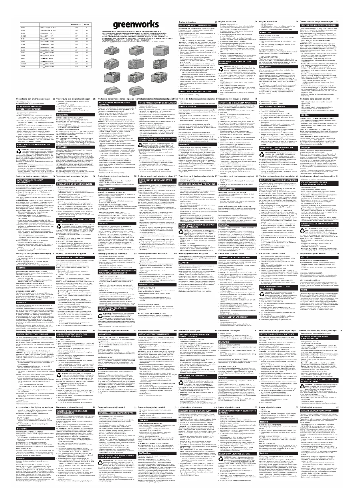 - Si un voyant à LED clignote, le bloc batterie est presque épuisé et doit être rechargé. FONCTIONS DE PROTECTION DE BATTERIE: Ces pack-batteries lithium-ion sont conçus avec des fonctions de protection des cellules lithium-ion et de maximisation de la vie de la batterie. FONCTIONNEMENT PAR TEMPS FROID: Le pack-batterie lithium-ion peut fonctionner par des températures atteignant -14°C (6,8°F). Placez le packbatterie sur l’outil et utilisez l’outil pour une application peu exigeante. Après environ une minute, le pack chauffe et commence à fonctionner normalement. GARANTIE (Les conditions générales complètes de la garantie se trouvent sur la page Web de Greenworks) La garantie Greenworks est de 3 ans sur le produit et de 2 ans sur les batteries (usage de consommateur / privé) à compter de la date d'achat. Cette garantie couvre les défauts de fabrication. Un produit défaillant sous garantie peut être réparé ou remplacé. La garantie d'une unité qui a fait l'objet d'abus ou d'un usage différent de celui décrit dans le manuel du propriétaire peut être refusée. L'usure normale et les pièces d'usure ne sont pas couvertes par la garantie. La garantie du fabricant d'origine n'est pas affectée par toute garantie additionnelle offerte par un distributeur ou un revendeur. Un produit défaillant doit être retourné au point d'achat, accompagné de sa preuve d'achat (reçu), an de prétendre à la garantie.