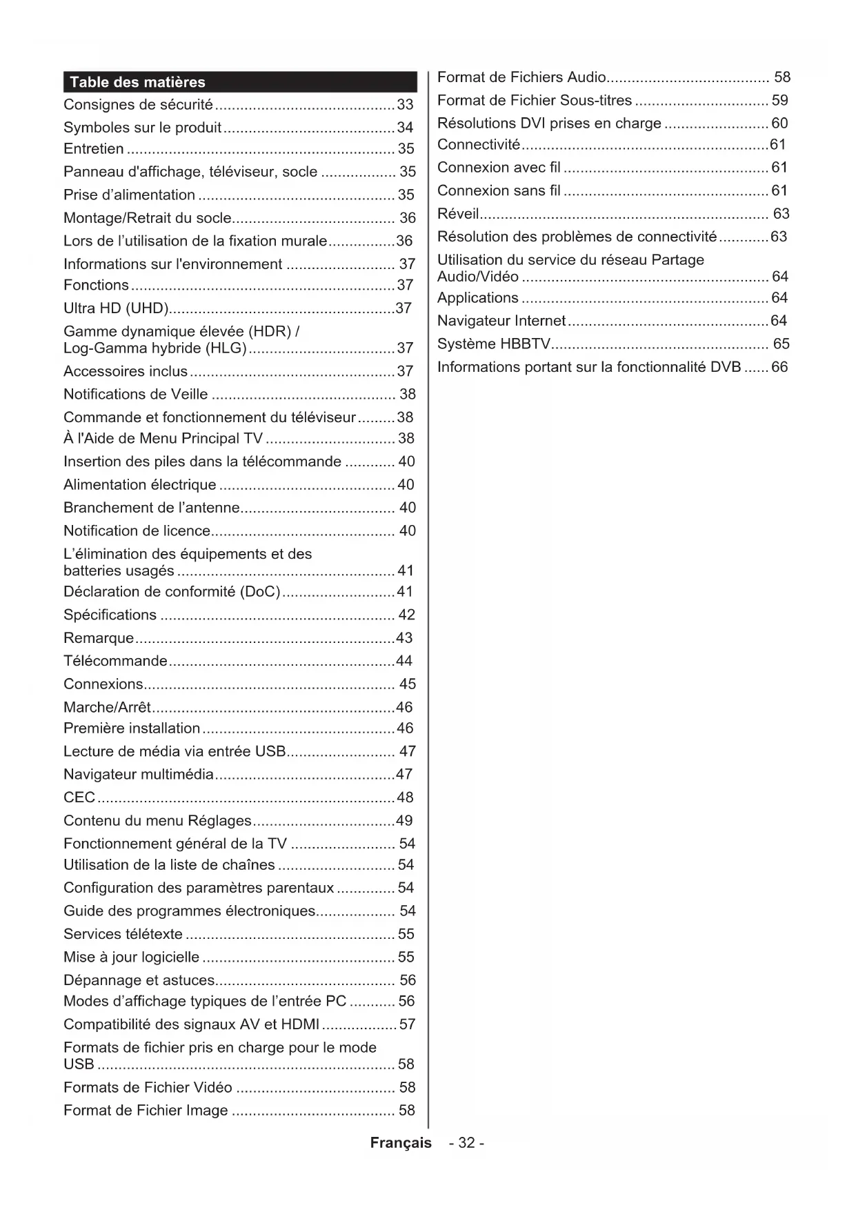 - L’application peut être interrompue et une autre application du bouton rouge de démarrage automatique peut être lancée. HbbTV permet aux applications d’être récupérées depuis la bande large ou la diffusion. Le diffuseur peut activer l’une des deux options ou les deux à la fois. Si la plateforme n’est pas dotée d’une connexion large bande opérationnelle, elle peut toujours lancer des applications transmises sur la diffusion. Les applications du bouton rouge autostart donnent généralement des liens vers d’autres applications. En voici un exemple. L’utilisateur peut alors basculer vers d’autres applications en utilisant les liens fournis. Les applications doivent donner un moyen de mettre un terme à leur exécution. Habituellement, la touche Quitter est utilisée à cet effet.Français - 66 - Schéma a : Application de la barre de démarrage Schéma b : L’application Guide de Programme Électronique, la vidéo de diffusion est indiquée dans le coin inférieur gauche ; elle peut être interrompue en appuyant sur le bouton 0. Les applications HbbTV utilisent les touches de la télécommande pour interagir avec l’utilisateur. Lorsqu’une application HbbTv est lancée, le contrôle de certaines touches revient à l’application. À titre d’exemple, la sélection des chaînes numériques peut ne pas fonctionner sur une application télétexte où les chiffres indiquent les pages de télétexte. HbbTV appelle une capacité de streaming AV sur la plate-forme. De nombreuses applications existent qui fournissent des services de rattrapage et de VOD (vidéo à la demande). L’utilisateur peut utiliser les touches Lire, Suspendre, Arrêter, Avance rapide et Retour rapide de la télécommande pour manipuler le contenu AV. Remarque: Vous pouvez activer ou désactiver cette fonction à partir de l'option Autres du menu Réglages>Système. Selon le modèle de votre téléviseur et l'option pays sélectionnée dans l'installation initiale, cette fonction peut être disponible dans le menu Paramètres>Système>Paramètres de Confidentialité au lieu du menu Paramètres>Système>Plus. Informations portant sur la fonctionnalité DVB L’utilisation de ce récepteur DVB est indiquée uniquement dans le pays pour lequel il a été fabriqué. Bien que ce récepteur DVB soit conforme aux spécifications DVB les plus récentes au moment de sa fabrication, nous ne saurions en garantir la compatibilité avec les transmissions DVB ultérieures en raison des changements susceptibles d’intervenir dans les signaux et technologies de diffusion. Certaines fonctions du téléviseur numérique peuvent ne pas être disponibles dans tous les pays. Nous nous efforçons chaque jour à améliorer davantage la qualité de nos produits ; par conséquent, leurs spécifications peuvent changer sans préavis. Pour savoir où acheter des accessoires, veuillez contacter le magasin dans lequel vous avez acheté votre équipement.Español - 67 - İndice Información De Seguridad ..................................... 68 Marcas en el producto ........................................... 68 Mantenimiento ....................................................... 70 Panel de visualización, Gabinete, Pedestal .......... 70 Cable de alimentación ........................................... 70 Montaje / Desmontaje del pedestal ....................... 70 Cuando se utiliza el soporte de pared que cuelga 71 Información medioambiental ................................. 71 Funciones .............................................................. 72 Ultra HD (UHD) ...................................................... 72 Alto Rango Dinámico (HDR) / Gama de Registro Híbrido (HLG) .......................... 72 Accesorios Incluidos .............................................. 72 Notificaciones del modo en espera ....................... 72 Control y Funcionamiento del Televisor ................. 73 Usando el menú principal de TV ........................... 73 Colocación de las pilas en el mando a distancia ... 74 Conexión Eléctrica................................................. 74 Conexión de la Antena .......................................... 74 Aviso sobre la licencia ........................................... 75 Eliminación de Aparatos Viejos y de Pilas y Baterías ................................................................. 75 Declaración de conformidad (DoC) ....................... 76 Características....................................................... 76 Aviso ......................................................................77 Mando a Distancia ................................................. 78 Conexiones............................................................ 79 Encendido/Apagado .............................................. 80 Instalación inicial ................................................... 80 Reproducción multimedia por la entrada USB ...... 81 Explorador Multimedia ........................................... 81 CEC ....................................................................... 82 Contenido del menú de Configuración .................. 83 Funcionamiento general del televisor .................... 88 Manejo de la lista de canales ................................ 88 Configurar las Opciones de Control parental ........ 88 Guía electrónica de programación ........................ 88 Servicios de Teletexto ............................................ 89 Actualización de Software ..................................... 89 Solución de problemas y consejos ........................ 90 Modos habituales de visualización de entrada de PC ....................................................... 90 Compatibilidad con señales AV y HDMI ................ 91 Formatos admitidos para el modo USB................. 92 Formatos de archivos de video ............................. 92 Formatos de archivo de imagen ............................ 92 Formatos de archivos de audio ..