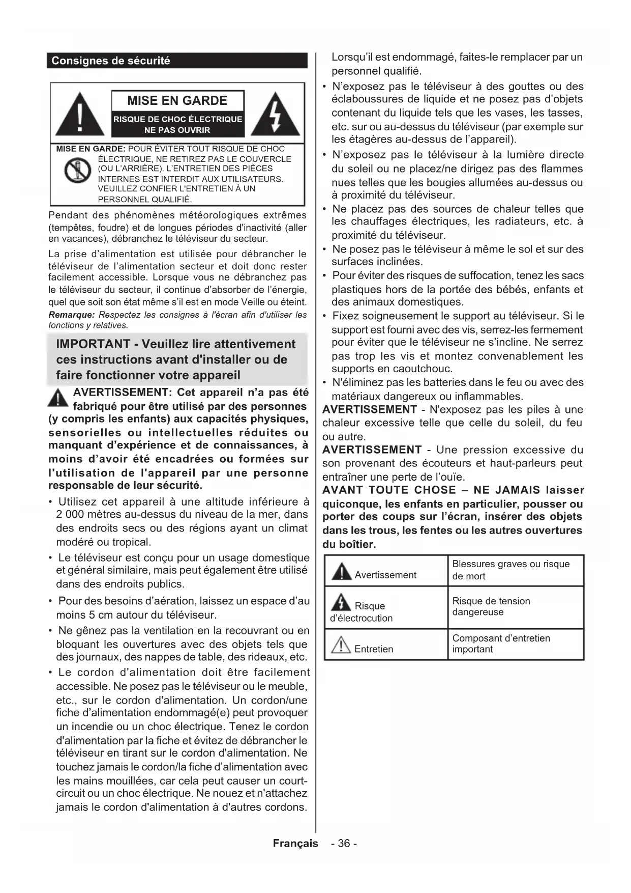 PERSONNEL QUALIFIÉ. Remarque: Respectez les consignes à l'écran afin d'utiliser les fonctions y relatives. Pendant des phénomènes météorologiques extrêmes (tempêtes, foudre) et de longues périodes d'inactivité (aller en vacances), débranchez le téléviseur du secteur. La prise d’alimentation est utilisée pour débrancher le téléviseur de l’alimentation secteur et doit donc rester facilement accessible. Lorsque vous ne débranchez pas le téléviseur du secteur, il continue d’absorber de l’énergie, quel que soit son état même s’il est en mode Veille ou éteint. IMPORTANT - Veuillez lire attentivement ces instructions avant d'installer ou de faire fonctionner votre appareil
