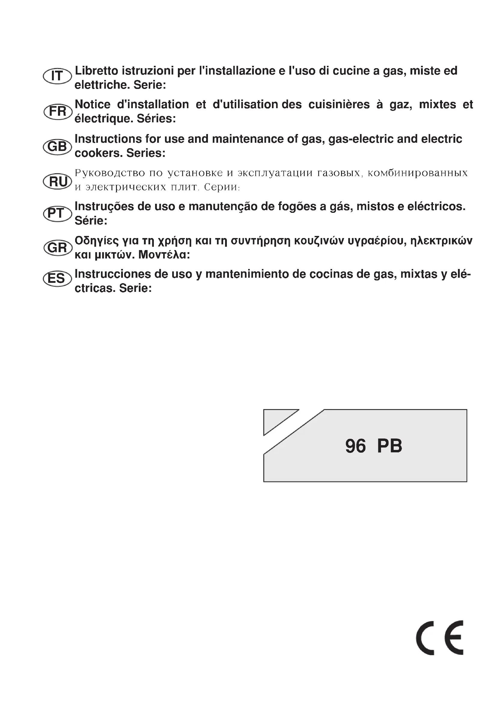 Le symbole représenté sur la figure, présent sur l’emballage, indique que les matériaux et objets destinés à entrer en contact avec des denrées alimentaires sont conformes, dans ce produit, à ce qui est prescrit par le règlement européen n° 1935/2004. À l’intérieur de la cavité du four les aliments pourraient entrer en contact avec : les grilles du four, les lèchefrites, les plaques à pâtisserie, le verre de la porte du four, les joints en catouchouc, les broches des tournebroches, les parois du four. Sur la table de cuisson avec : les grilles, les brûleurs et le plan de cuisson. Dans le tiroir chauffe-plats avec : les parois du tiroir. Pour l'utilisateur FR29 Nominal external dimensions Cookers 96 PB Height at hob Height with lid raised Depth with door closed Depth with door open Width cm 85,0 cm 141,0 cm 59,0 cm 100,0 cm 90,0 Usable dimensions Oven Electric oven Width Depth Height Volume cm 39,5 cm 42,0 cm 31,5 l. 52,0 cm 39,5 cm 40,0 cm 31,5 l. 50,0 ELECTRIC HOTPLATES ø 145 1,0 kW - Normal hotplate ø 180 1,5 kW - Normal hotplate