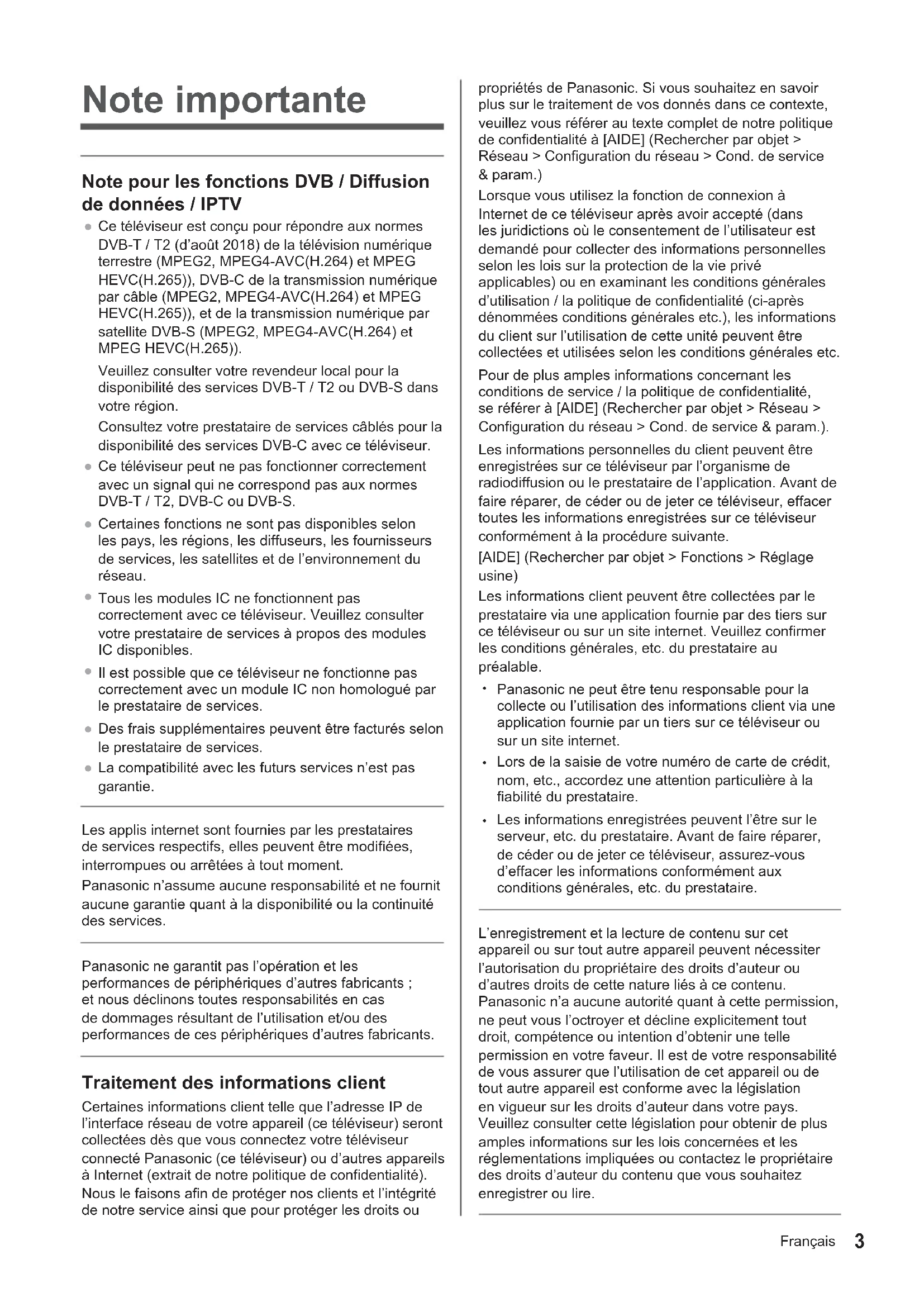 La compatibilité avec les futurs services n’est pas garantie. Les applis internet sont fournies par les prestataires de services respectifs, elles peuvent être modifiées, interrompues ou arrêtées à tout moment. Panasonic n’assume aucune responsabilité et ne fournit aucune garantie quant à la disponibilité ou la continuité des services. Panasonic ne garantit pas l’opération et les performances de périphériques d’autres fabricants ; et nous déclinons toutes responsabilités en cas de dommages résultant de l’utilisation et/ou des performances de ces périphériques d’autres fabricants. Traitement des informations client Certaines informations client telle que l’adresse IP de l’interface réseau de votre appareil (ce téléviseur) seront collectées dès que vous connectez votre téléviseur connecté Panasonic (ce téléviseur) ou d’autres appareils à Internet (extrait de notre politique de confidentialité). Nous le faisons afin de protéger nos clients et l’intégrité de notre service ainsi que pour protéger les droits ou propriétés de Panasonic. Si vous souhaitez en savoir plus sur le traitement de vos donnés dans ce contexte, veuillez vous référer au texte complet de notre politique de confidentialité à [AIDE] (Rechercher par objet > Réseau > Configuration du réseau > Cond. de service & param.) Lorsque vous utilisez la fonction de connexion à Internet de ce téléviseur après avoir accepté (dans les juridictions où le consentement de l’utilisateur est demandé pour collecter des informations personnelles selon les lois sur la protection de la vie privé applicables) ou en examinant les conditions générales d’utilisation / la politique de confidentialité (ci-après dénommées conditions générales etc.), les informations du client sur l’utilisation de cette unité peuvent être collectées et utilisées selon les conditions générales etc. Pour de plus amples informations concernant les conditions de service / la politique de confidentialité, se référer à [AIDE] (Rechercher par objet > Réseau > Configuration du réseau > Cond. de service & param.). Les informations personnelles du client peuvent être enregistrées sur ce téléviseur par l’organisme de radiodiffusion ou le prestataire de l’application. Avant de faire réparer, de céder ou de jeter ce téléviseur, effacer toutes les informations enregistrées sur ce téléviseur conformément à la procédure suivante. [AIDE] (Rechercher par objet > Fonctions > Réglage usine) Les informations client peuvent être collectées par le prestataire via une application fournie par des tiers sur ce téléviseur ou sur un site internet. Veuillez confirmer les conditions générales, etc. du prestataire au préalable.