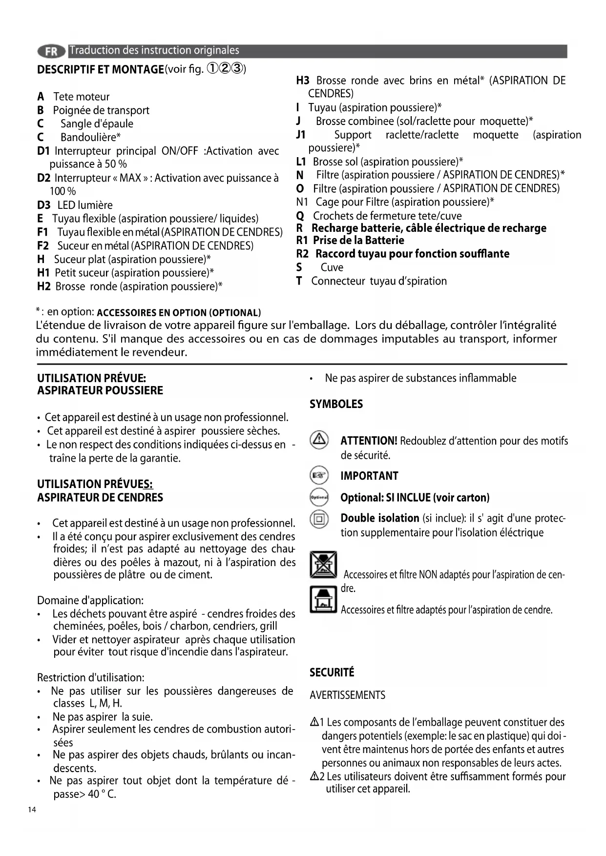 - Ne pas aspirer de substances inflammable SYMBOLES ATTENTION! Redoublez d’attention pour des motifs de sécurité. IMPORTANT Optional: SI INCLUE (voir carton) Double isolation (si inclue): il s' agit d'une protec- tion supplementaire pour l'isolation éléctrique Accessoires et filtre NON adaptés pour l’aspiration de cen- dre. Accessoires et filtre adaptés pour l’aspiration de cendre. SECURITÉ AVERTISSEMENTS