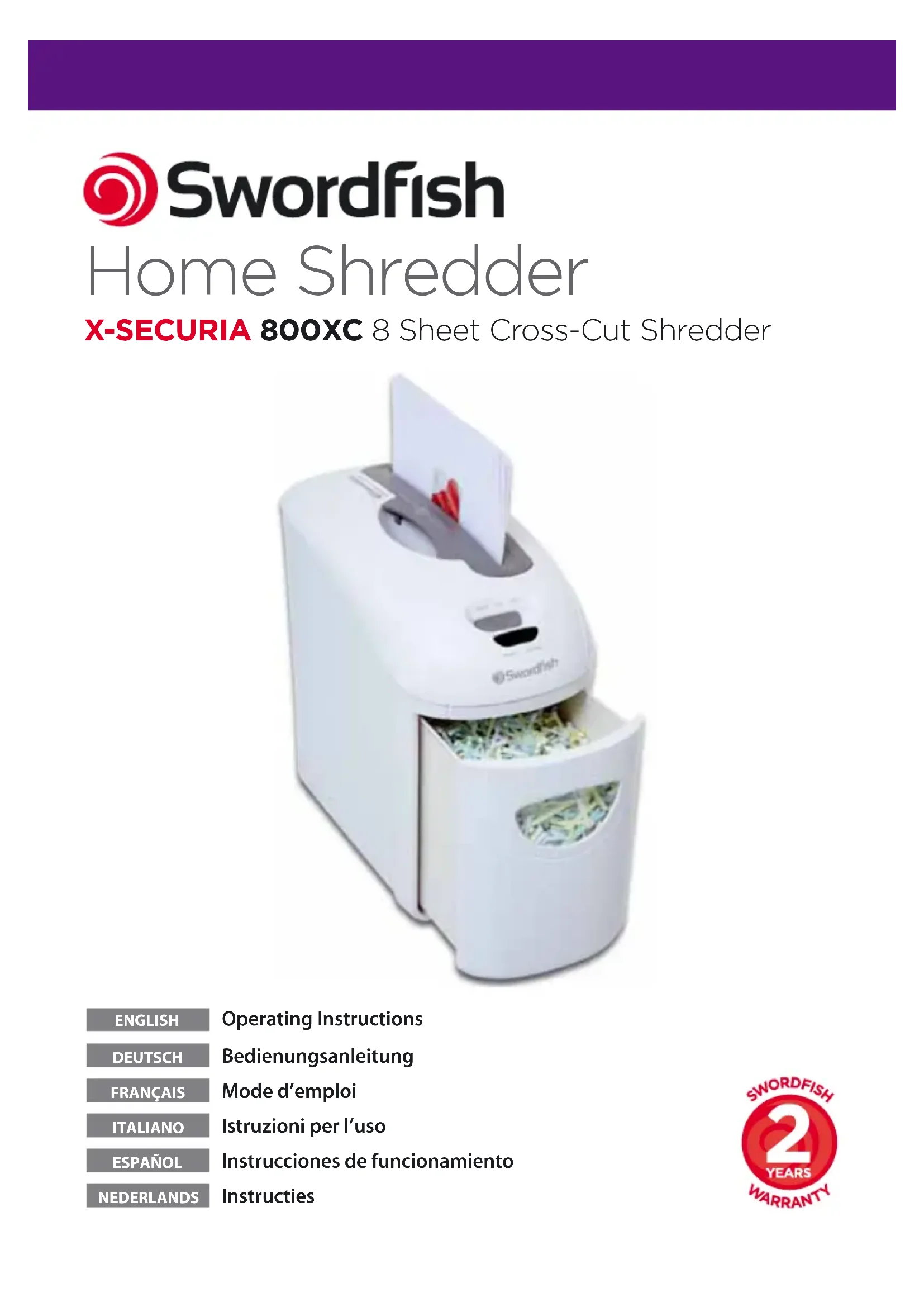 XSecuria 800XC - Destructeur de document Swordfish - Notice d'utilisation et mode d'emploi gratuit