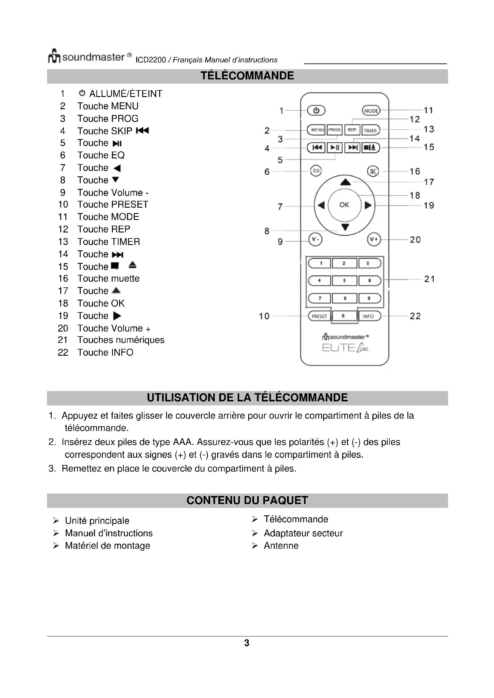 ➢ Unité principale ➢ Télécommande ➢ Manuel d’instructions ➢ Adaptateur secteur ➢ Matériel de montage ➢ AntenneICD2200 / Français Manuel d’instructions