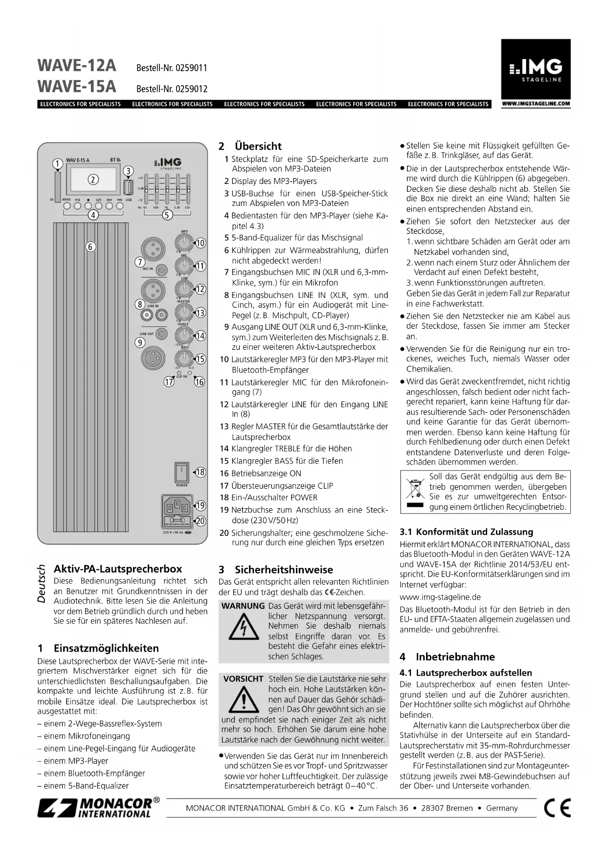 Par la présente MONACOR INTERNATIONAL dé- clare que le module Bluetooth dans les appareils WAVE-12A et WAVE-15A répond à la directive 2014 / 53 / UE. Les déclarations de conformité sont disponibles sur le site : www.img-stageline.com Le module Bluetooth est autorisé dans les pays de l’U.E. et les pays de l’A.E.L.E. et n’est pas sou- mis à déclaration ou taxe. 4 Fonctionnement