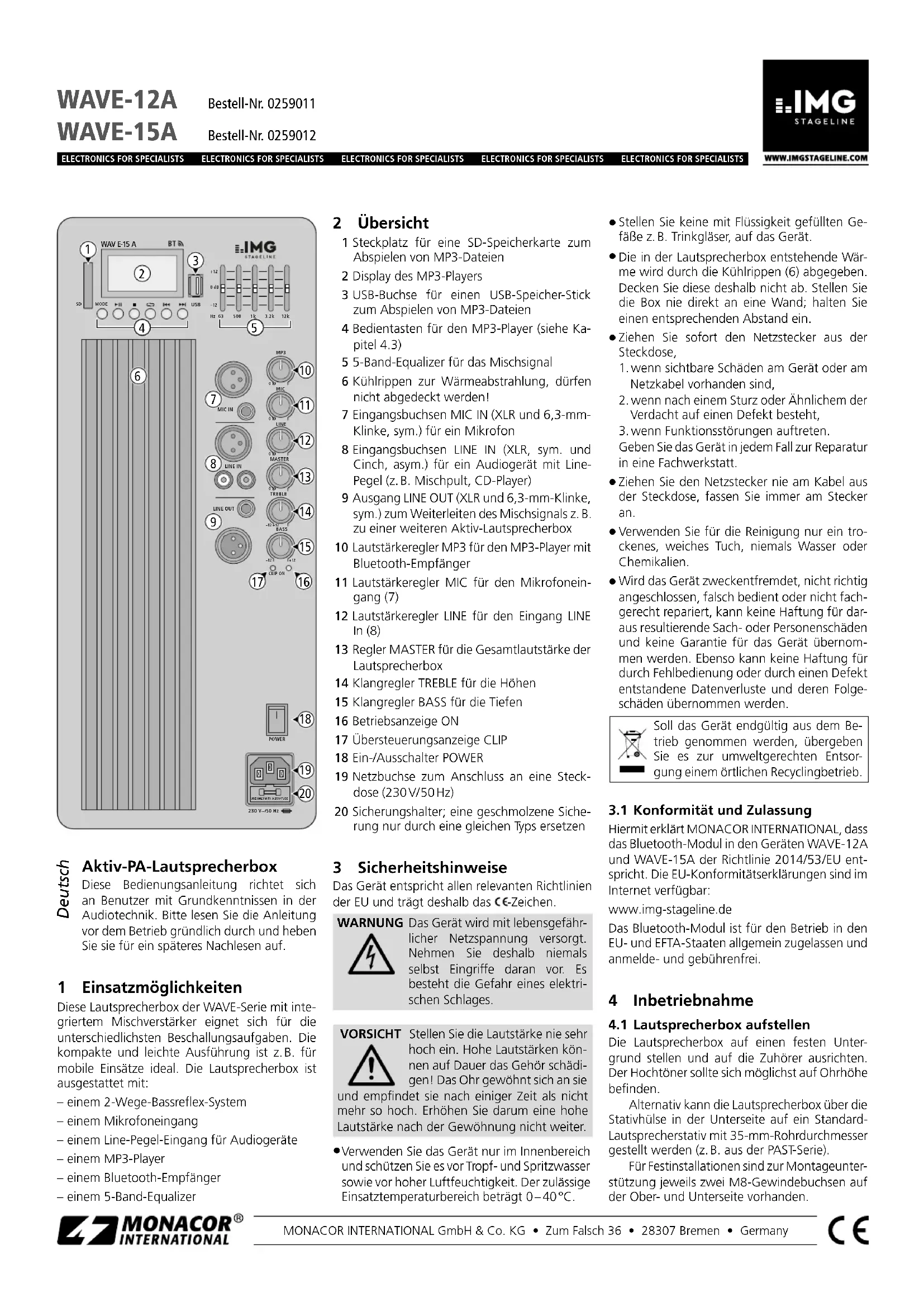 Par la présente MONACOR INTERNATIONAL dé- clare que le module Bluetooth dans les appareils WAVE-12A et WAVE-15A répond à la directive 2014 / 53 / UE. Les déclarations de conformité sont disponibles sur le site : www.img-stageline.com Le module Bluetooth est autorisé dans les pays de l’U.E. et les pays de l’A.E.L.E. et n’est pas sou- mis à déclaration ou taxe. 4 Fonctionnement