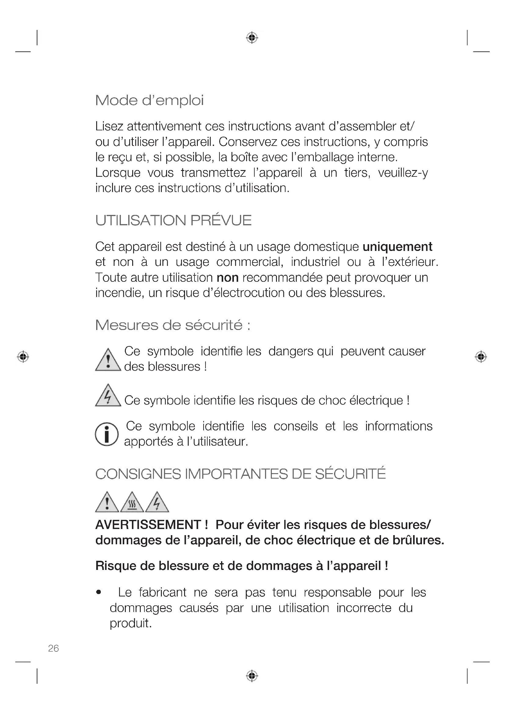 Cet appareil est destiné à un usage domestique uniquement et non à un usage commercial, industriel ou à l’extérieur. Toute autre utilisation non recommandée peut provoquer un incendie, un risque d’électrocution ou des blessures. Mesures de sécurité : Ce symbole identifie les dangers qui peuvent causer des blessures ! Ce symbole identifie les risques de choc électrique ! Ce symbole identifie les conseils et les informations apportés à l’utilisateur.