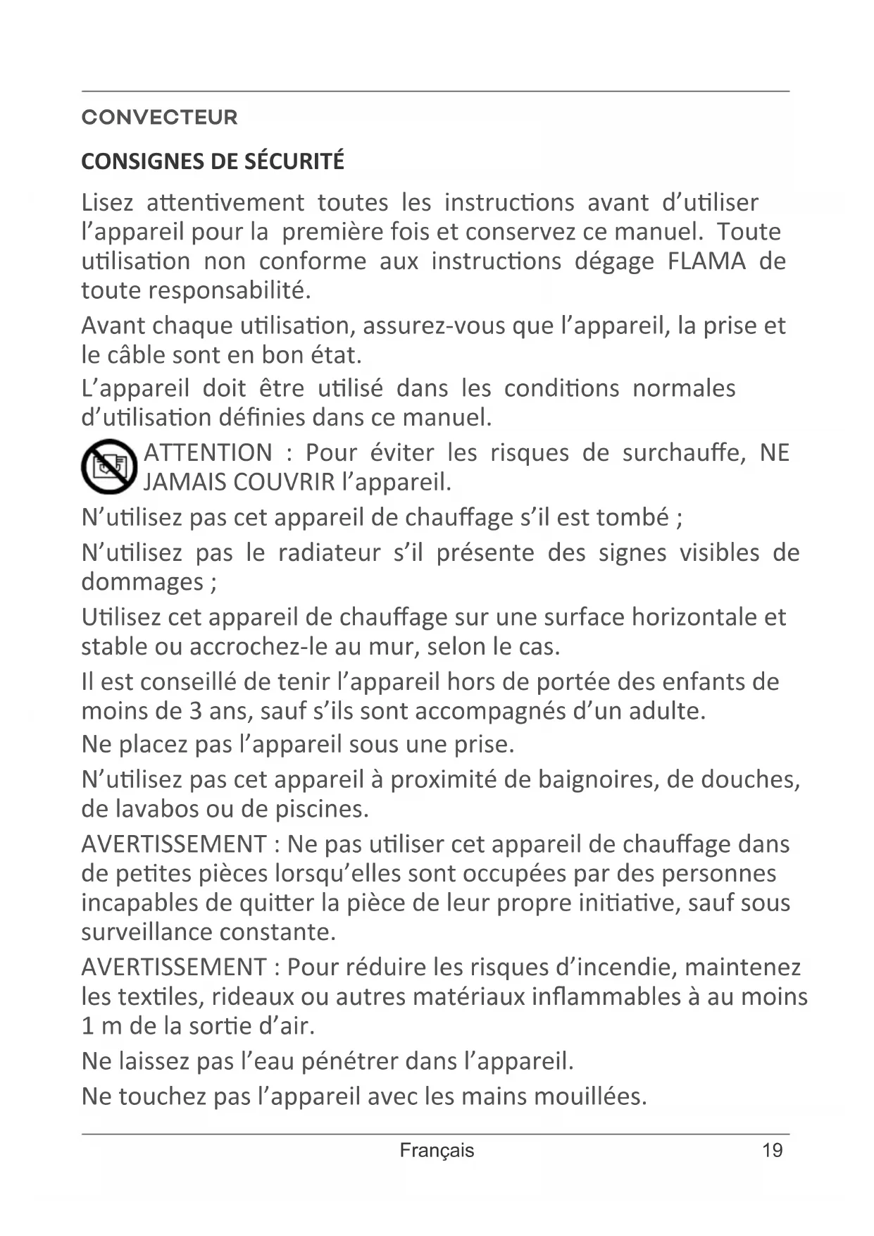 Lisez aenvement toutes les instrucons avant d’uliser l’appareil pour la première fois et conservez ce manuel. Toute ulisaon non conforme aux instrucons dégage FLAMA de toute responsabilité. Avant chaque ulisaon, assurez-vous que l’appareil, la prise et le câble sont en bon état. L’appareil doit être ulisé dans les condions normales d’ulisaon dénies dans ce manuel. ATTENTION : Pour éviter les risques de surchaue, NE JAMAIS COUVRIR l’appareil. N’ulisez pas cet appareil de chauage s’il est tombé ; N’ulisez pas le radiateur s’il présente des signes visibles de dommages ; Ulisez cet appareil de chauage sur une surface horizontale et stable ou accrochez-le au mur, selon le cas. Il est conseillé de tenir l’appareil hors de portée des enfants de moins de 3 ans, sauf s’ils sont accompagnés d’un adulte. Ne placez pas l’appareil sous une prise. N’ulisez pas cet appareil à proximité de baignoires, de douches, de lavabos ou de piscines.
