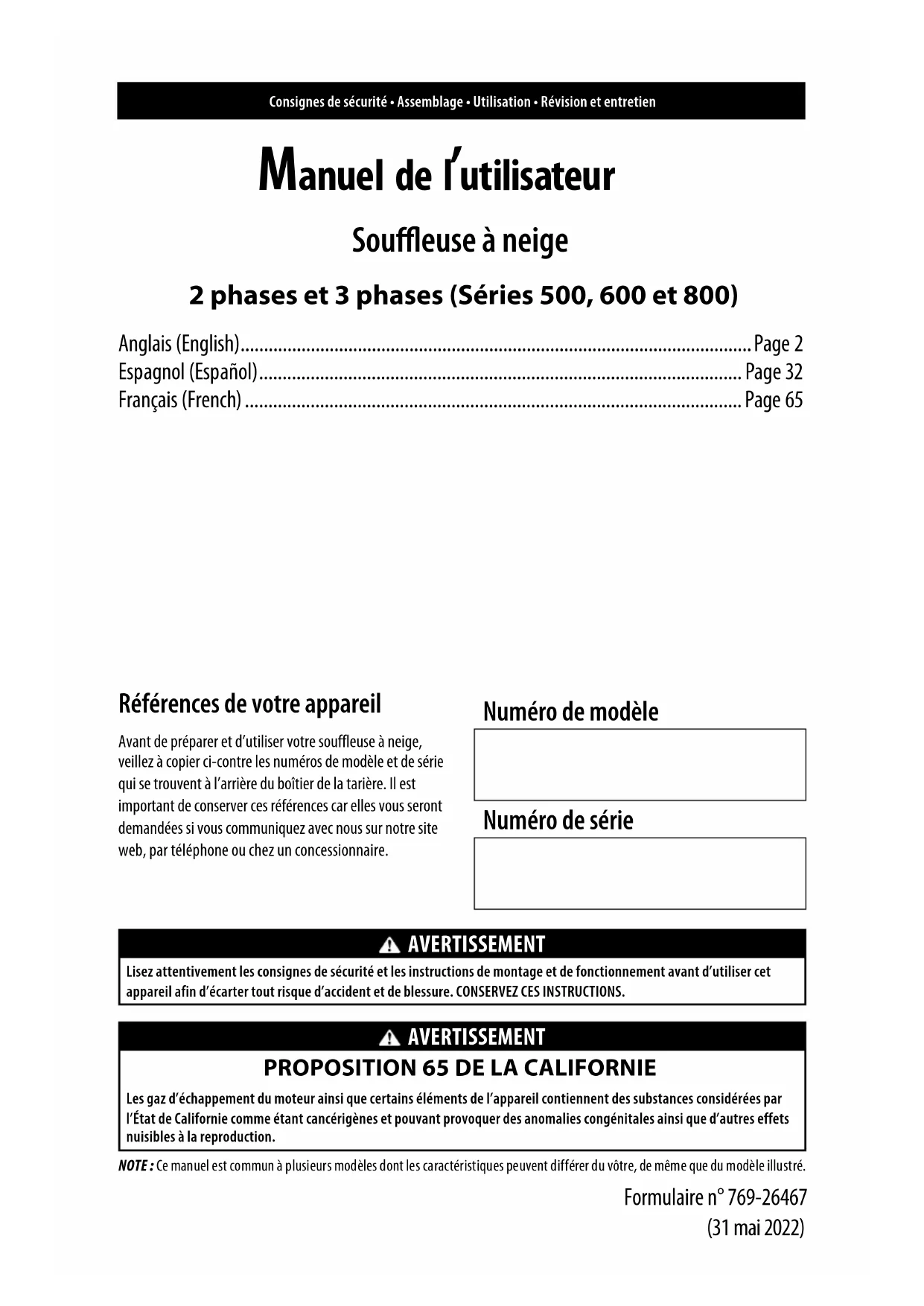 Les gaz d’échappement du moteur ainsi que certains éléments de l’appareil contiennent des substances considérées par l’État de Californie comme étant cancérigènes et pouvant provoquer des anomalies congénitales ainsi que d’autres effets nuisibles à la reproduction. NOTE : Ce manuel est commun à plusieurs modèles dont les caractéristiques peuvent différer du vôtre, de même que du modèle illustré. Références de votre appareil Avant de préparer et d’utiliser votre souffleuse à neige, veillez à copier ci-contre les numéros de modèle et de série qui se trouvent à l’arrière du boîtier de la tarière. Il est important de conserver ces références car elles vous seront demandées si vous communiquez avec nous sur notre site web, par téléphone ou chez un concessionnaire. Numéro de modèle Numéro de série Anglais (English) .............................................................................................................Page 2 Espagnol (Español) .......................................................................................................Page 32 Français (French) .......................................................................................................... Page 65 Formulaire n° 769-26467 (31 mai 2022)66