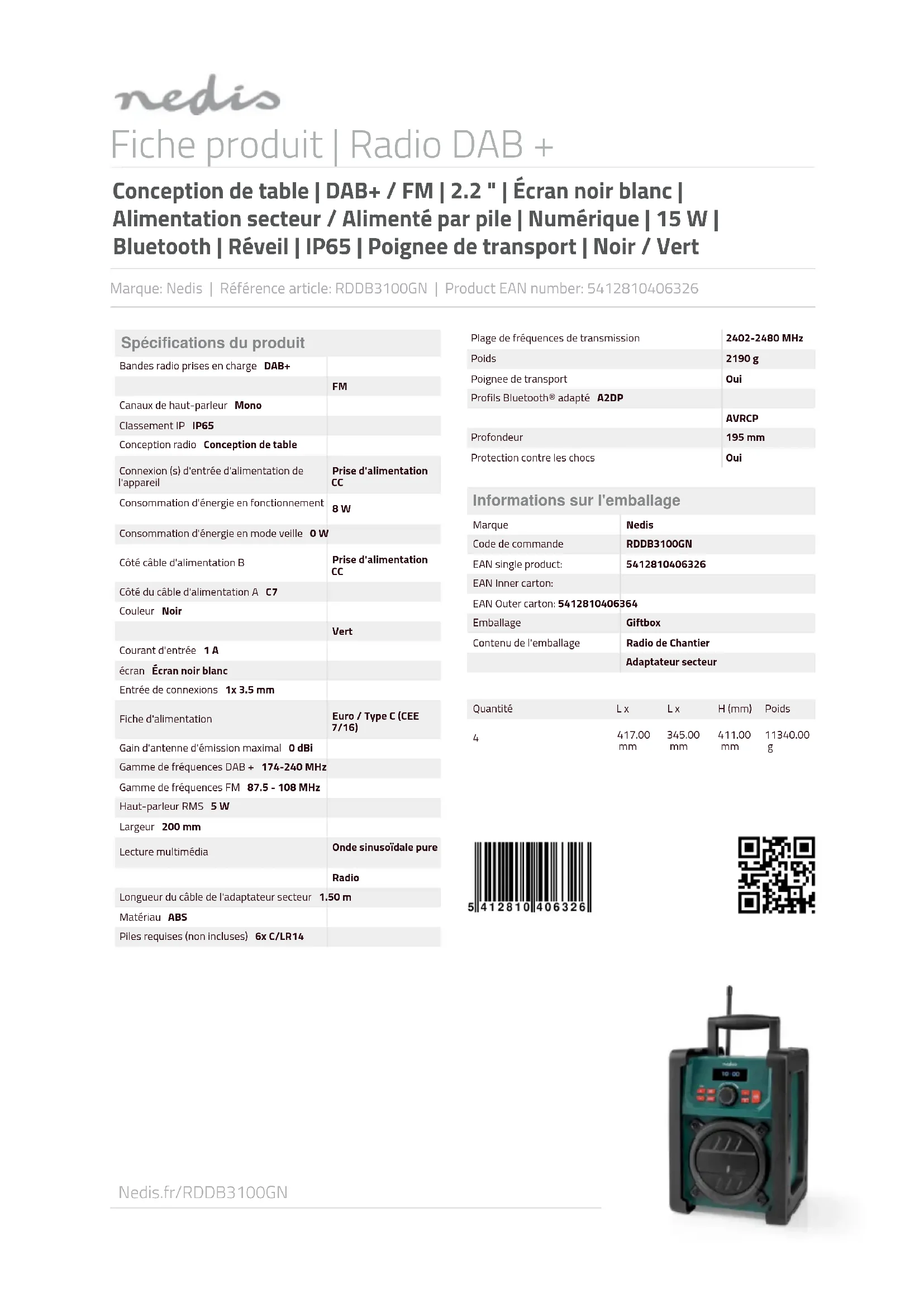 Nedis.fr/RDDB3100GN Fiche produit | Radio DAB + Conception de table | DAB+ / FM | 2.2 " | Écran noir blanc | Alimentation secteur / Alimenté par pile | Numérique | 15 W | Bluetooth | Réveil | IP65 | Poignee de transport | Noir / Vert Marque: Nedis | Référence article: RDDB3100GN | Product EAN number: 5412810406326 Spécifications du produit Bandes radio prises en charge DAB+
