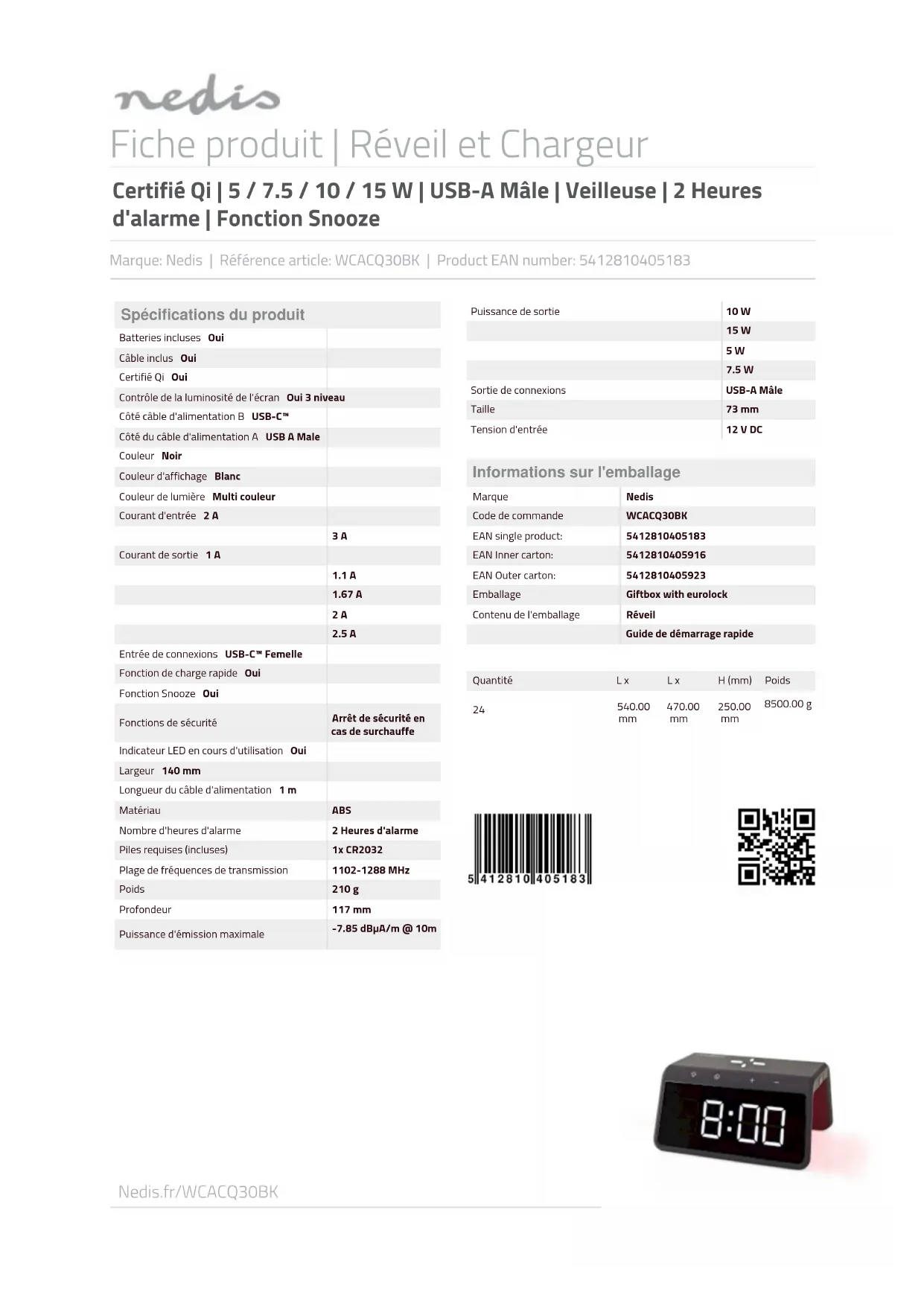 Nedis.fr/WCACQ30BK Fiche produit | Réveil et Chargeur Certifié Qi | 5 / 7.5 / 10 / 15 W | USB-A Mâle | Veilleuse | 2 Heures d'alarme | Fonction Snooze Marque: Nedis | Référence article: WCACQ30BK | Product EAN number: 5412810405183 Spécifications du produit Batteries incluses Oui Câble inclus Oui Certifié Qi Oui Contrôle de la luminosité de l'écran Oui 3 niveau Côté câble d'alimentation B USB-C™ Côté du câble d'alimentation A USB A Male Couleur Noir Couleur d'affichage Blanc Couleur de lumière Multi couleur Courant d'entrée 2 A 3 A Courant de sortie 1 A