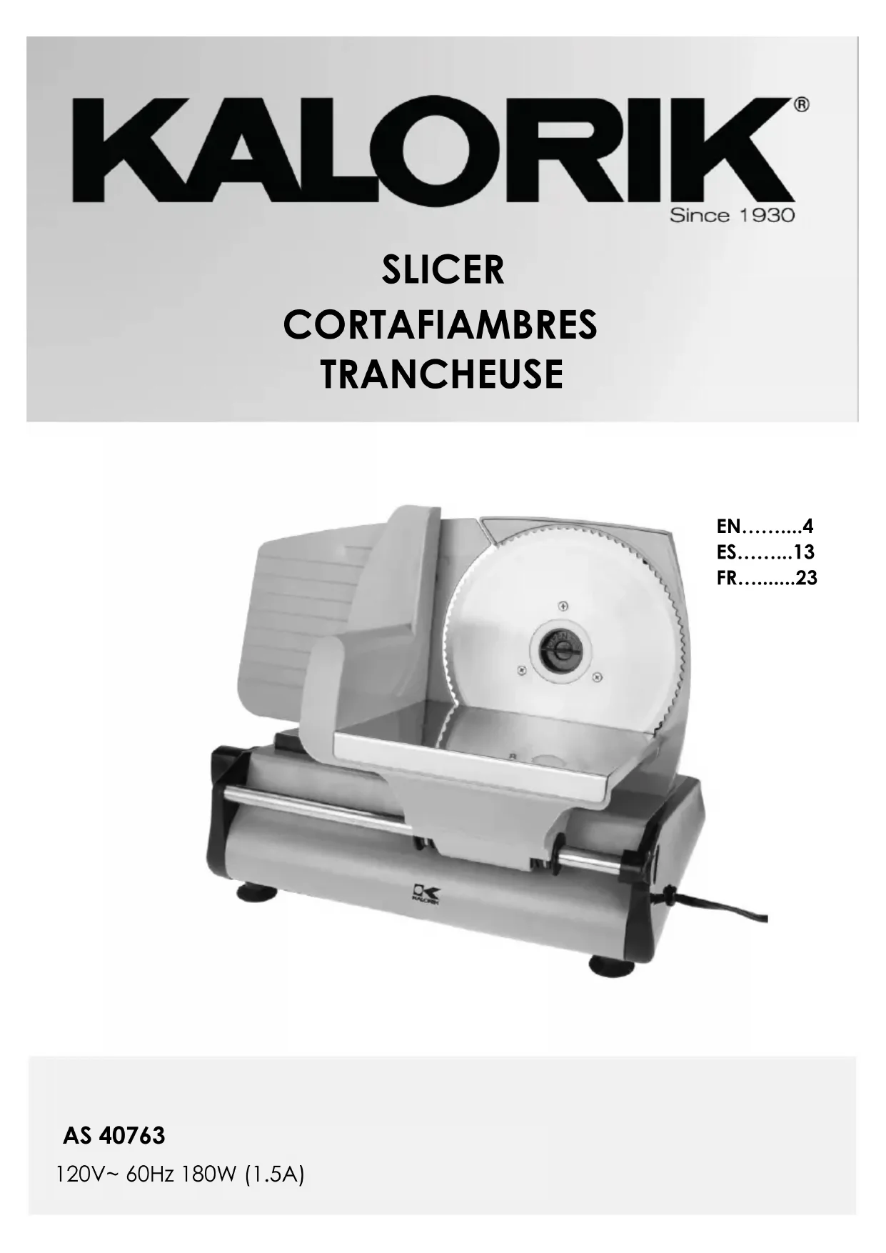 AS 40763 S - Trancheuse KALORIK - Notice d'utilisation et mode d'emploi gratuit