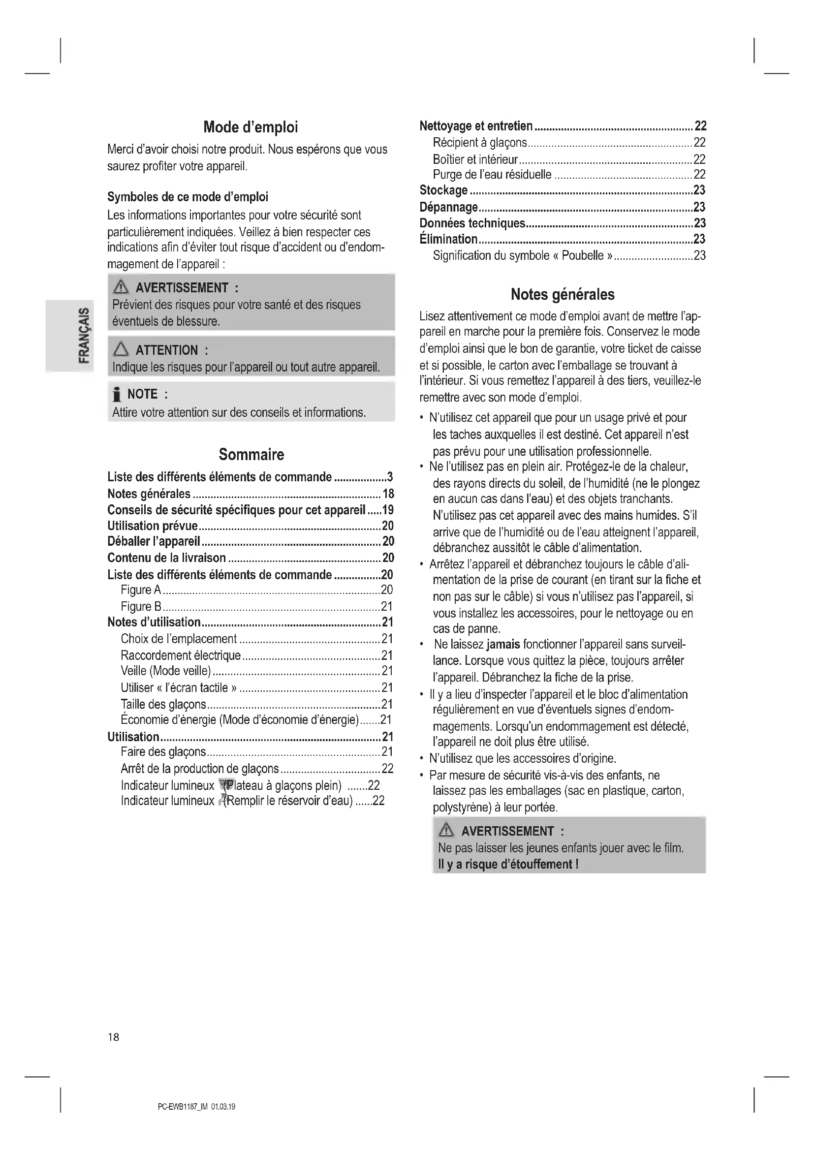 - Conservez toujours l’appareil hors de portée des enfants et dans un endroit sec et bien aéré. Dépannage Problème Cause possible Solution Ne fonctionne pas. Absence d’alimentation. Essayez la prise avec un autre appareil. Branchez correctement la che secteur. Vériez le disjoncteur principal. L’appareil est défectueux. Contactez notre centre de service ou un spécialiste. Compresseur bruyant. Alimentation sur secteur trop faible. Éteignez l’appareil et vériez l’alimentation sur secteur. L’indicateur lumineux clignote. Remplir le réservoir d’eau. Remplissez d’eau « Faire des glaçons ». Les glaçons sont trop petits. Température ambiante trop élevée. Placer l’appareil dans un endroit plus frais. S’assurer d’une circulation d’air sufsante autour de l’appareil. La température de l’eau est trop élevée. Arrêter la production de glace. Vider l’eau et remplir d’eau froide (max. 20 °C). Une mauvaise taille des glaçons a été sélectionnée. Appuyez sur le bouton MODE pour sélectionner l’une des plus grandes tailles de glaçon, M ou L. Les petits cubes de glace sont de taille normale pendant les premiers cycles de production. Les glaçons sont trop gros et collent entre eux. La température de l’eau ou celle de l’air ambiant est trop basse. Cessez la production de glace. Drainez de l’eau et remplissez avec de l’eau refroidie (max. 35 °C). L’icône s’illumine. Le plateau à glaçons est bloqué par des glaçons trop gros. Attendez que les glaçons de desserrent. Rallumez l’appareil. Utilisez ON / OFF pour redémarrer. Données techniques Caractéristiques techniques : ......................... PC-EWB 1187 Tension d’alimentation : ...........................220 240 V~, 50 Hz Puissance d’entrée : ..................................................... 0,68 A Production de glaçons : ......................... 10 15 kg / 24 heures Volume du réservoir d’eau : ............................... env. 1,7 litres Liquide de refroidissement : ................................ R600a / 23 g Classe de protection : ............................................................ Classe de climat : ..................................................................T Poids net : ............................................................env. 9,20 kg Nous nous réservons le droit d’apporter des modications techniques ainsi que des modications de conception dans le cadre du développement continu de nos produits. Cet appareil a été contrôlé d’après toutes les directives européennes actuelles applicables, comme par exemple concernant la compatibilité électromagnétique et la basse tension. Cet appareil a été fabriqué en respect des régle- mentations techniques de sécurité les plus récentes. Élimination Signication du symbole « Poubelle » Protégez votre environnement, ne jetez pas vos appareils électriques avec les ordures mé- nagères. Utilisez, pour l’élimination de vos appareils électriques, les bornes de collecte prévues à cet effet où vous pouvez vous débarrasser des appareils que vous n’utilisez plus. Vous contribuez ainsi à éviter les impacts potentiels dans l’environnement et sur la santé de chacun, causés par une mauvaise élimination de ces déchets. Vous contribuez aussi au recyclage sous toutes ses formes des appareils électriques et électroniques usagés. Vous trouverez toutes les informations sur les bornes d’élimination des appareils auprès de votre commune ou de l’administration de votre communauté.PC-EWB1187_IM 01.03.19