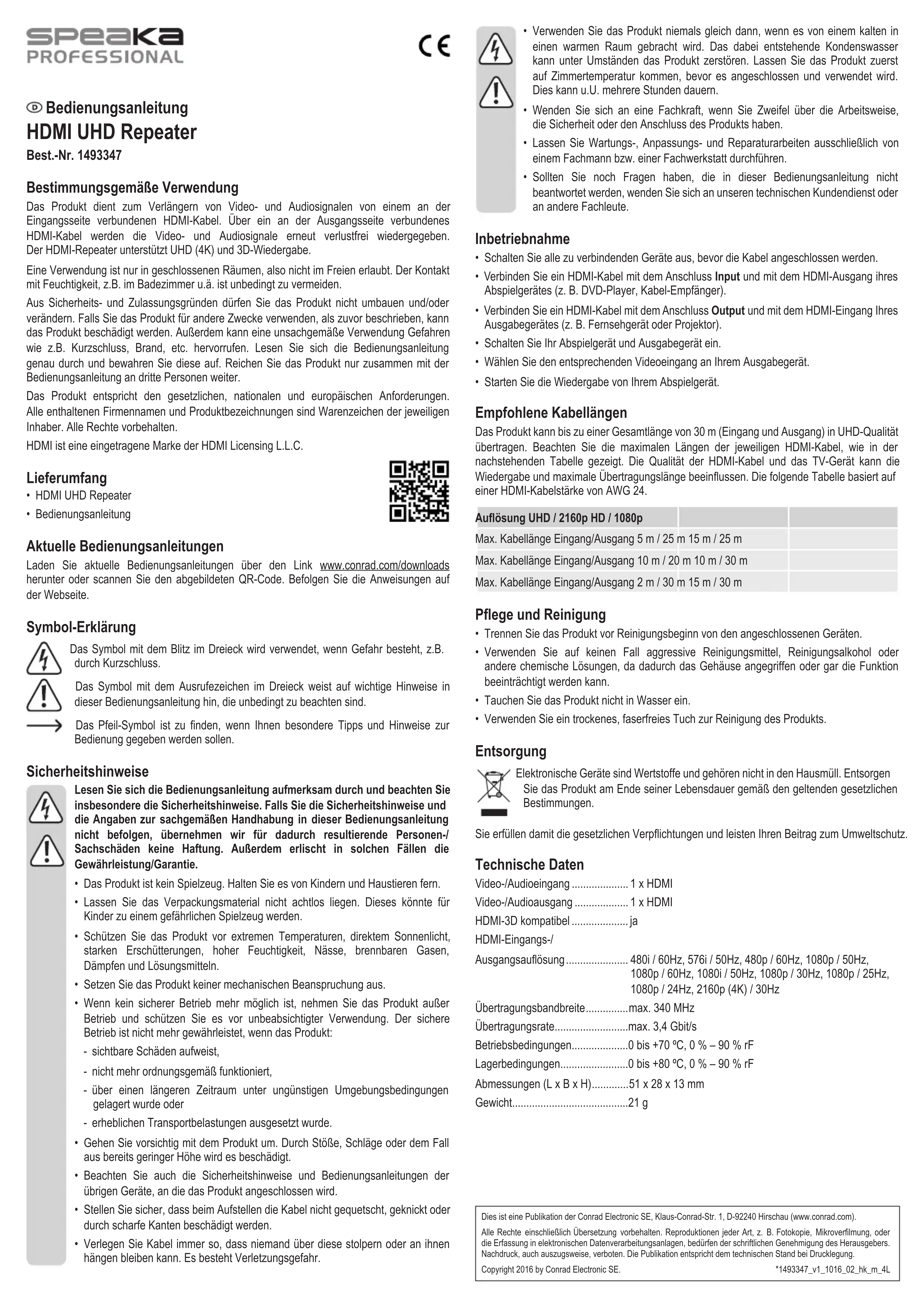 - Pour nettoyer le produit, utilisez un chiffon sec et non pelucheux. Elimination des déchets Les appareils électroniques sont des matériaux recyclables et ne doivent pas être éliminés avec les ordures ménagères. En n de vie, éliminez l'appareil conformément aux dispositions légales en vigueur. Vous respectez ainsi les ordonnances légales et contribuez à la protection de l'environnement. Caractéristiques techniques Entrée vidéo/audio .............................1 x HDMI Sortie vidéo/audio ..............................1 x HDMI Compatible HDMI-3D .......................oui Résolution entrée/ sortie HDMI ........................................ 480i / 60 Hz, 576i / 50 Hz, 480p / 60 Hz, 1080p / 50 Hz, 1080p / 60 Hz, 1080i / 50 Hz, 1080p / 30 Hz, 1080p / 25 Hz, 1080p / 24 Hz, 2160p (4K) / 30 Hz Largeur de bande de transmission ....max. 340 MHz Taux de transfert ................................max. 3,4 Go/s Conditions de service ........................0 à +70 °C, 0 % - 90 % d'humidité relative Conditions de stockage .....................0 à +80 °C, 0 % - 90 % d'humidité relative Dimensions (L x P x H) ......................51 x 28 x 13 mm Poids ..................................................21 g Mode d'emploi Répétiteur UHD HDMI Nº de commande 1493347 Utilisation prévue Le produit sert à répéter les signaux audio et vidéo en utilisant un câble HDMI connecté du côté de l'entrée. Les signaux audio et vidéo sont ensuite diffusés sans perte via le câble HDMI connecté du côté de la sortie. Le répétiteur HDMI UHD supporte la lecture 3D et UHD (4K). L'utilisation est uniquement autorisée en intérieur, dans les locaux fermés ; l'utilisation en plein air est interdite. Impérativement éviter tout contact avec l'humidité, par ex. dans la salle de bains, etc. Pour des raisons de sécurité et d'homologation, toute transformation et/ou modication du produit est interdite. Si vous utilisez le produit à d'autres ns que celles décrites précédemment, cela risque d'endommager le produit. Par ailleurs, une utilisation incorrecte peut être source de dangers tels que court-circuit, incendie, électrocution, etc. Lisez attentivement le mode d'emploi et conservez-le. Ne transmettez le produit à des tiers qu'accompagné de son mode d'emploi. Le produit est conforme aux exigences des directives européennes et nationales en vigueur. Tous les noms d'entreprises et appellations de produits contenus dans ce mode d'emploi sont des marques déposées des propriétaires correspondants. Tous droits réservés. HDMI est une marque déposée de HDMI Licensing L.L.C. Contenu d'emballage