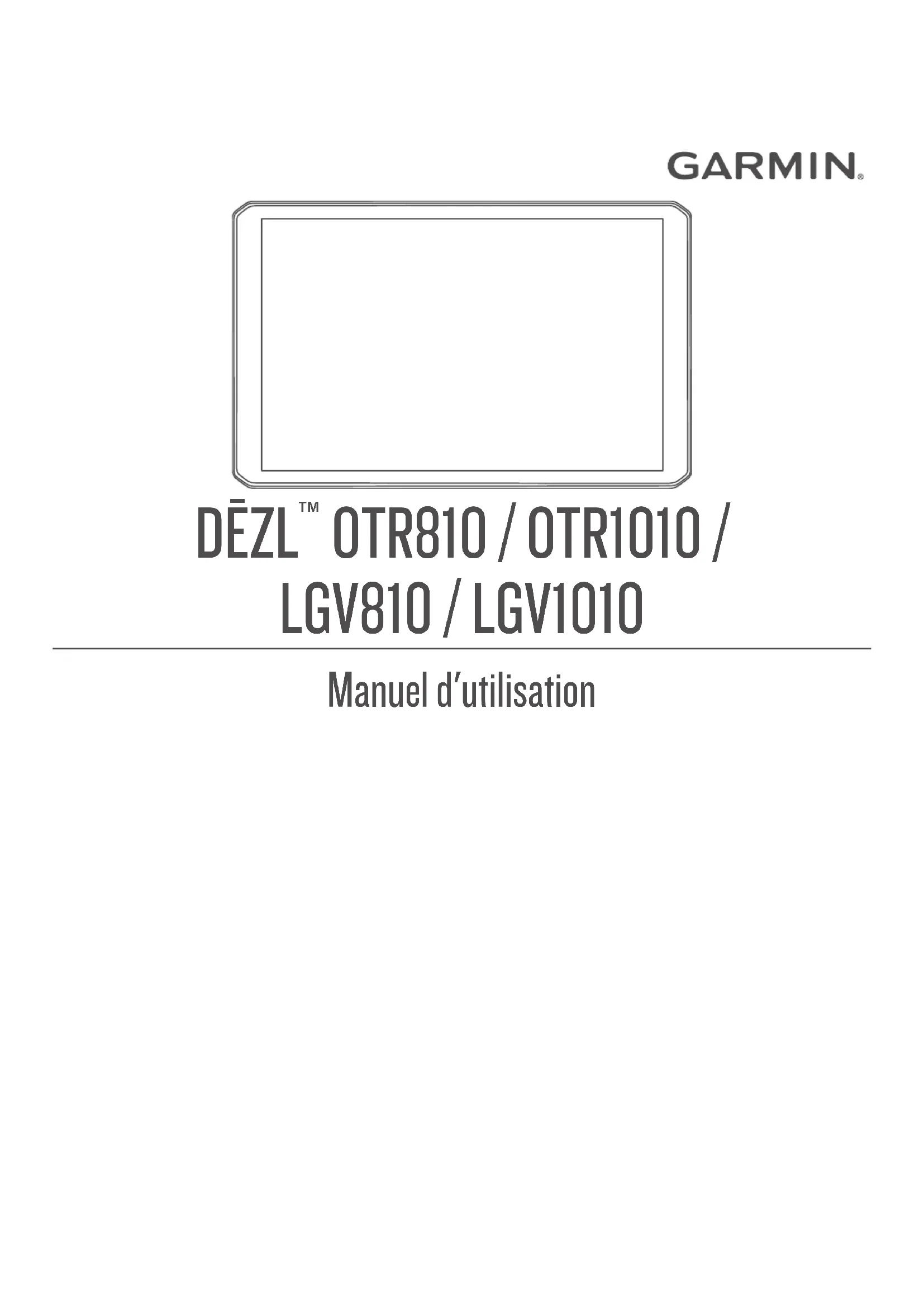 OTR810 / OTR1010 / LGV810 / LGV1010 Manuel d'utilisation© 2022 Garmin Ltd. ou ses filiales Tous droits réservés. Conformément aux lois relatives au copyright en vigueur, toute reproduction du présent manuel, qu'elle soit partielle ou intégrale, sans l'autorisation préalable écrite de Garmin, est interdite. Garmin se réserve le droit de modifier ou d'améliorer ses produits et d'apporter des modifications au contenu du présent manuel sans obligation d'en avertir quelque personne physique ou morale que ce soit. Consultez le site Web de Garmin à l'adresse www.garmin.com pour obtenir les dernières mises à jour, ainsi que des informations complémentaires concernant l'utilisation de ce produit. Garmin